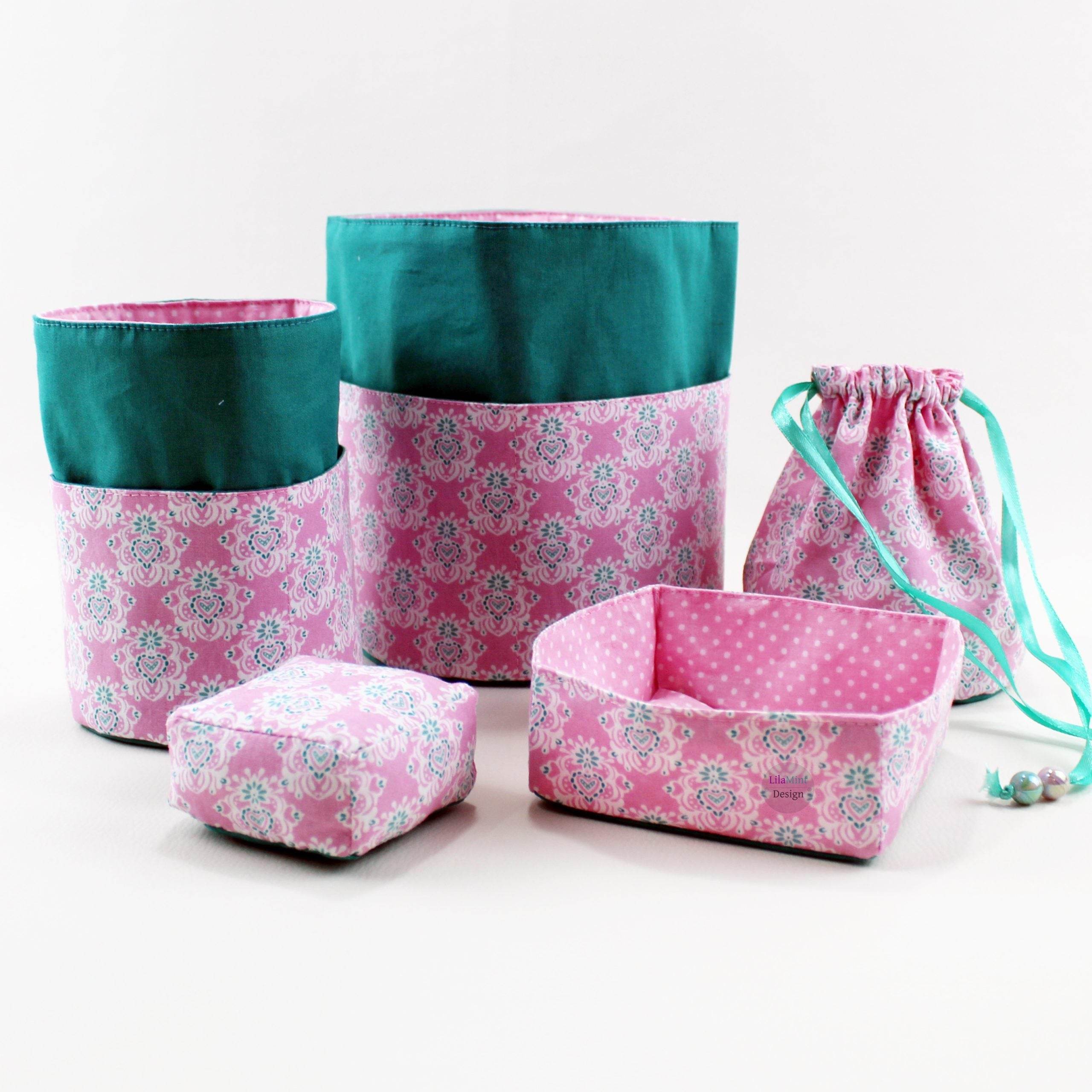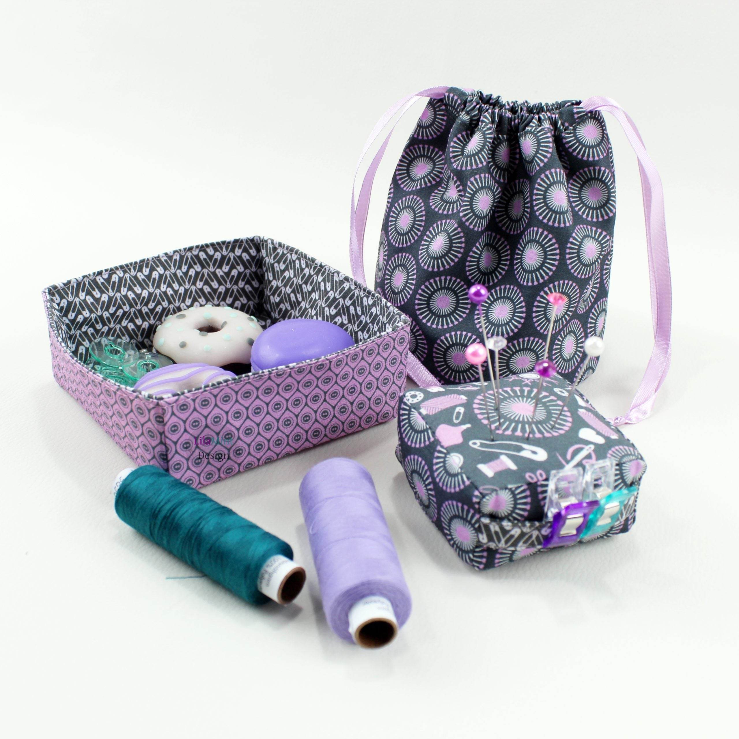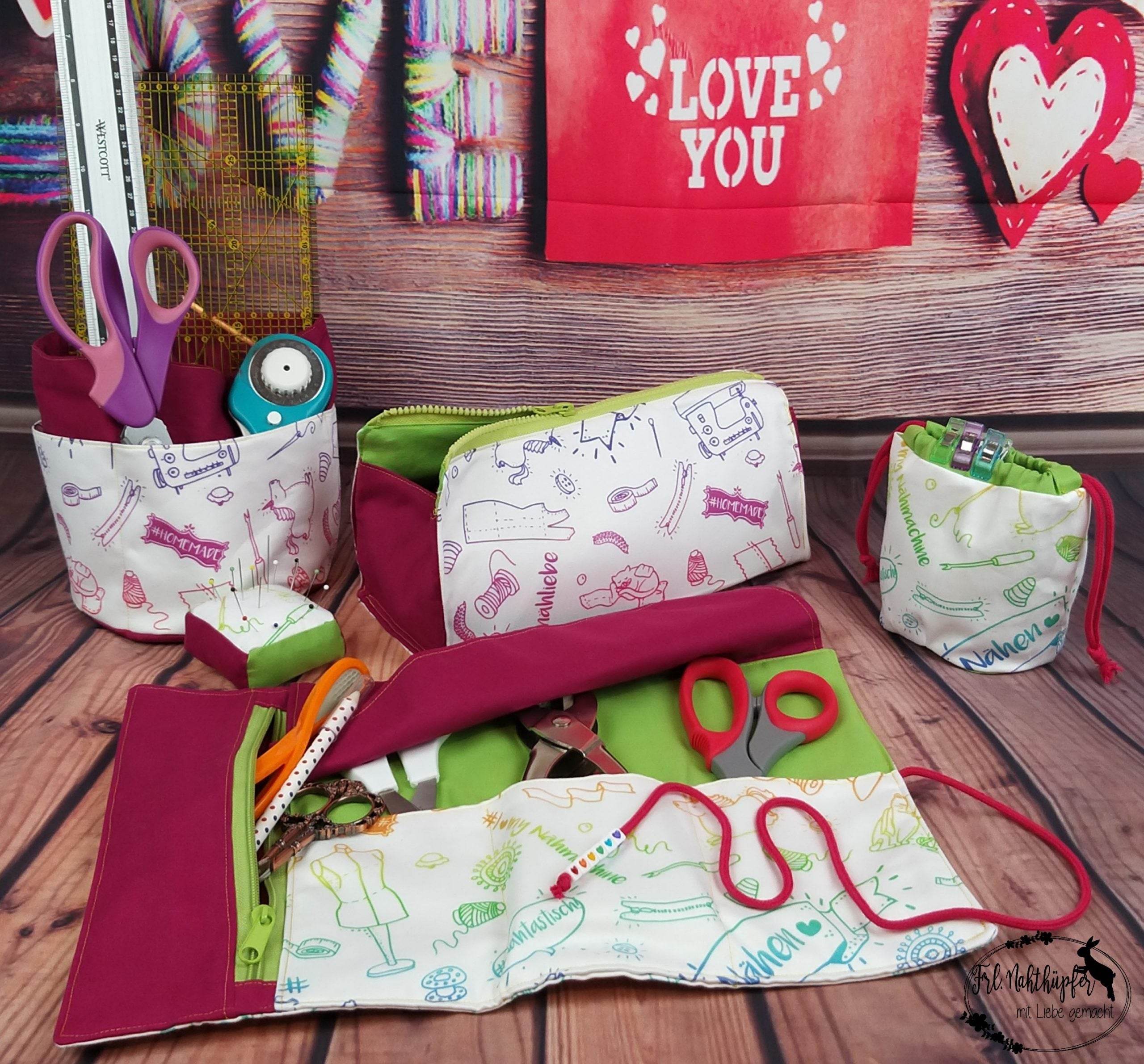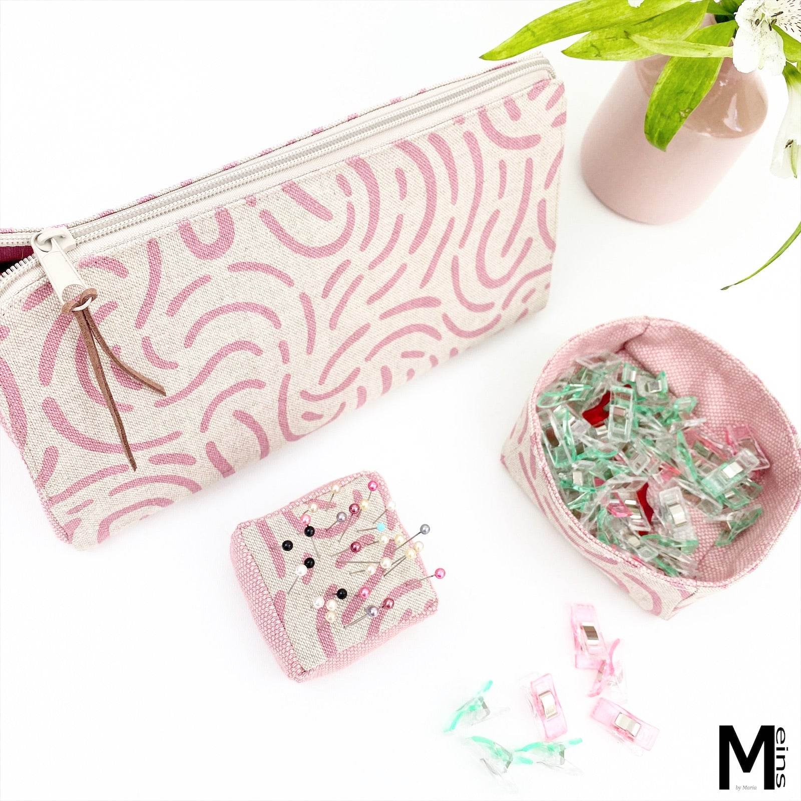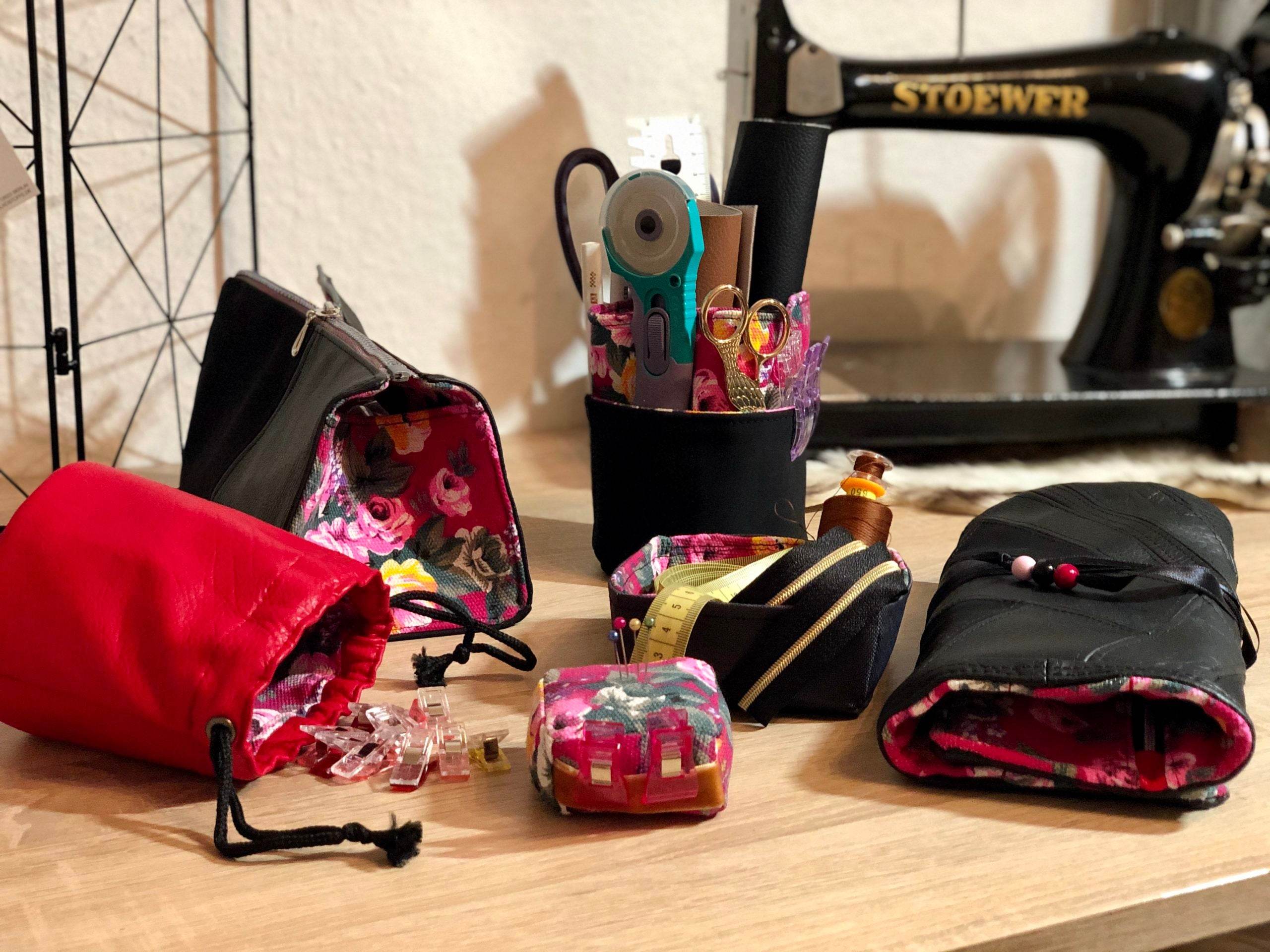 Das OrganizerSet Sewsie besteht aus 6 Teilen – ein Nadelkissen, ein eckiges Utensilo, ein rundes Utensilo in zwei Größen, ein Zugbeutel für Klammern, eine Nadelrolle in zwei Größen und eine Triangeltasche.