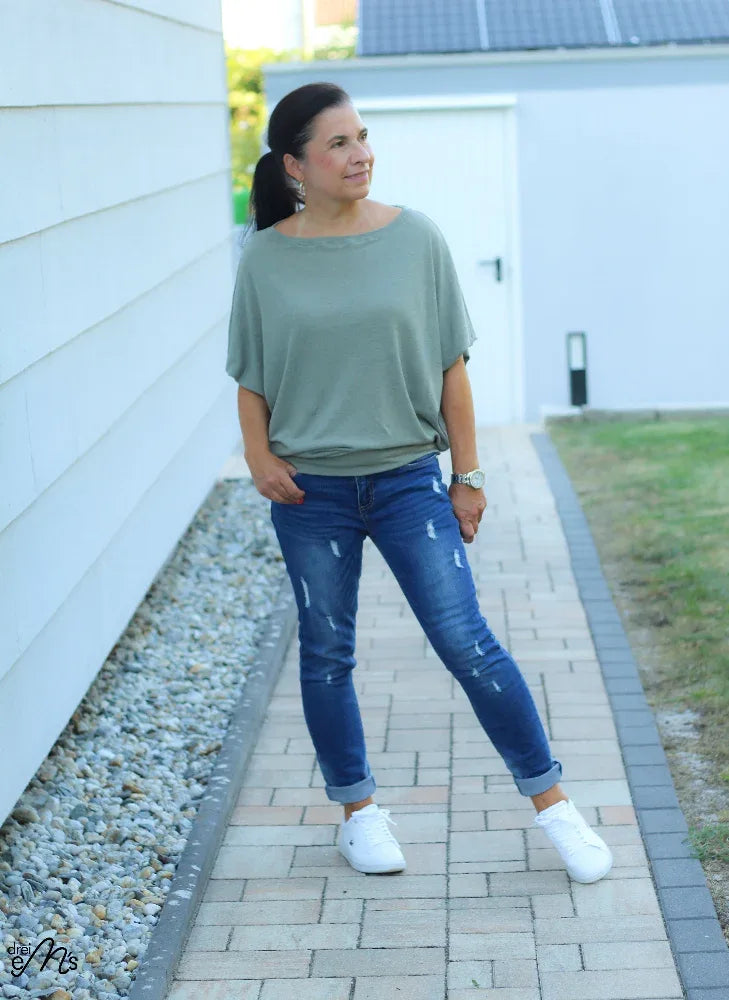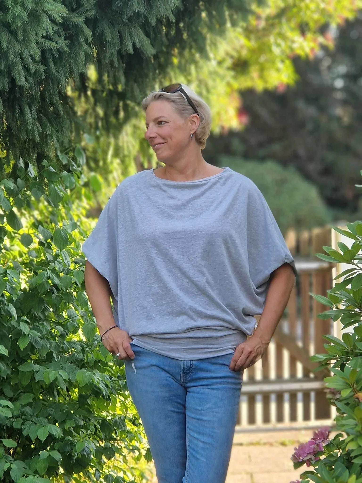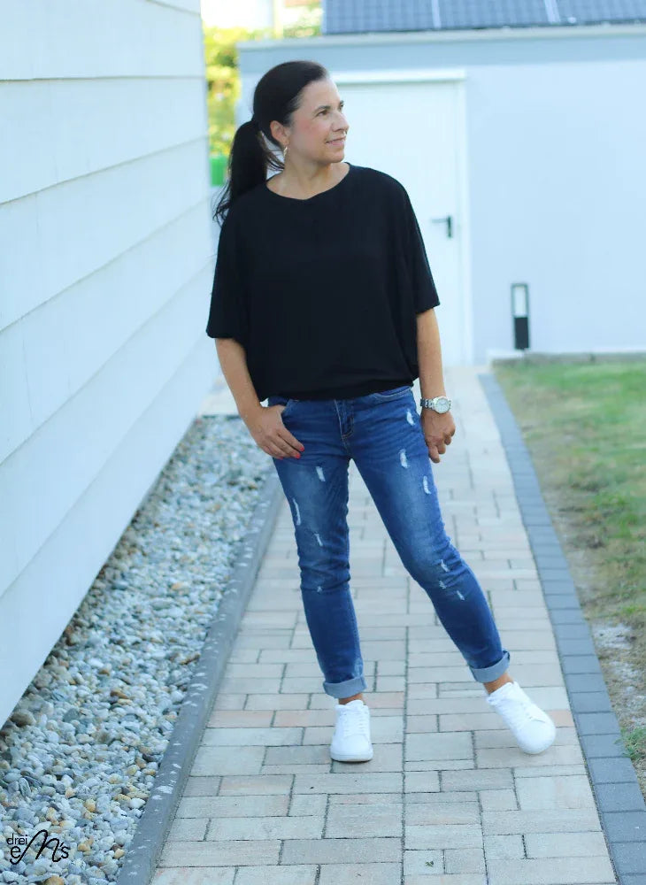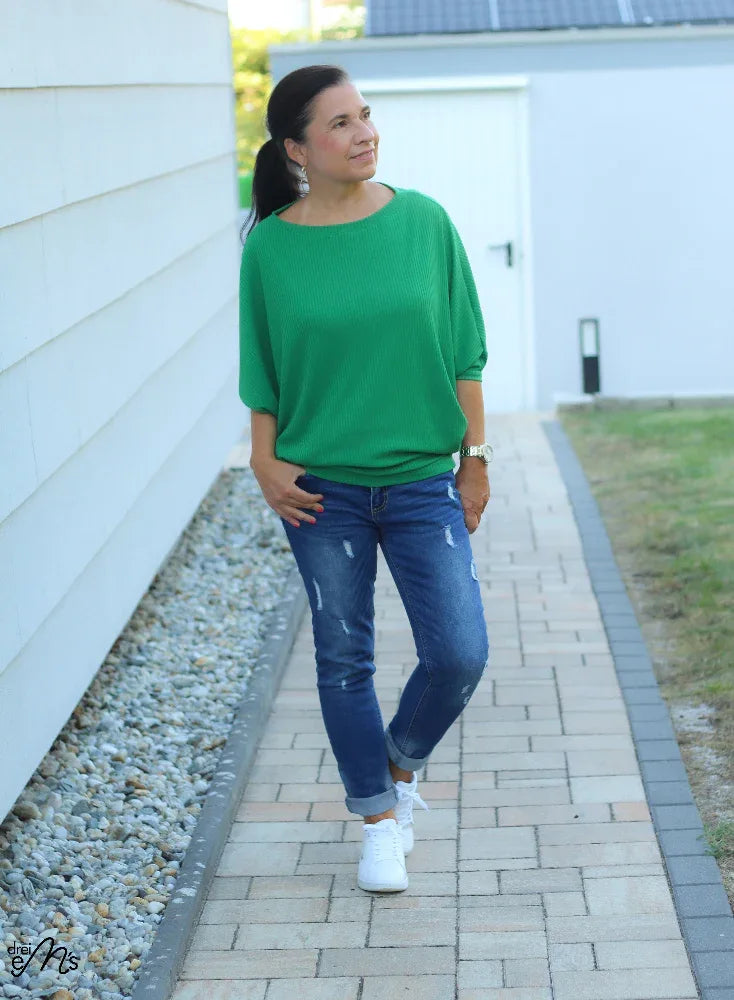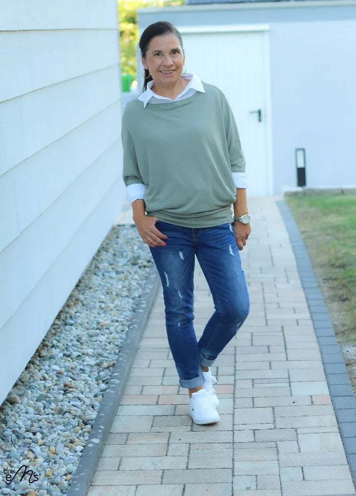 Der besondere Fledermaus-Schnitt mit 3/4-Ärmeln und Bündchen verleiht dem Pullover eine entspannte Silhouette, die zu jeder Figur passt. Du kannst wählen, ob du den Saumbund schmal oder breit arbeiten möchtest – ganz nach deinem Stil.