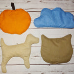 mit Wolke, Apfel, Hund, Katzenkopf, Hammer und Schraubenschlüssel.