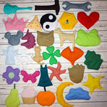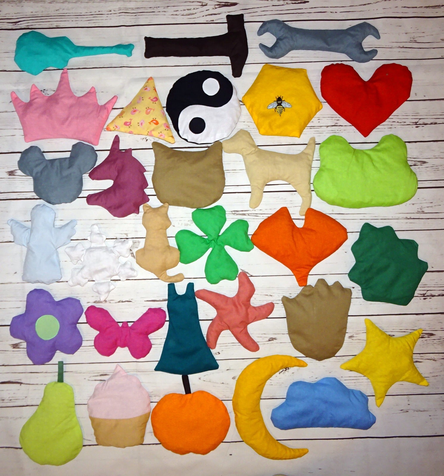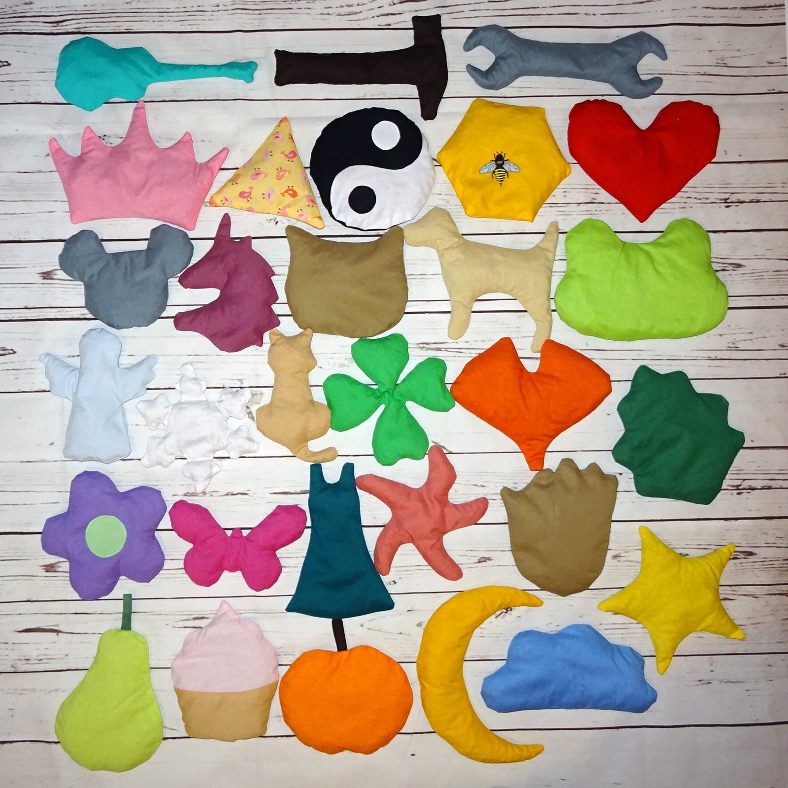 mit Schmetterling, Katze, Kleeblatt, Blume, Birne und Dreieck.