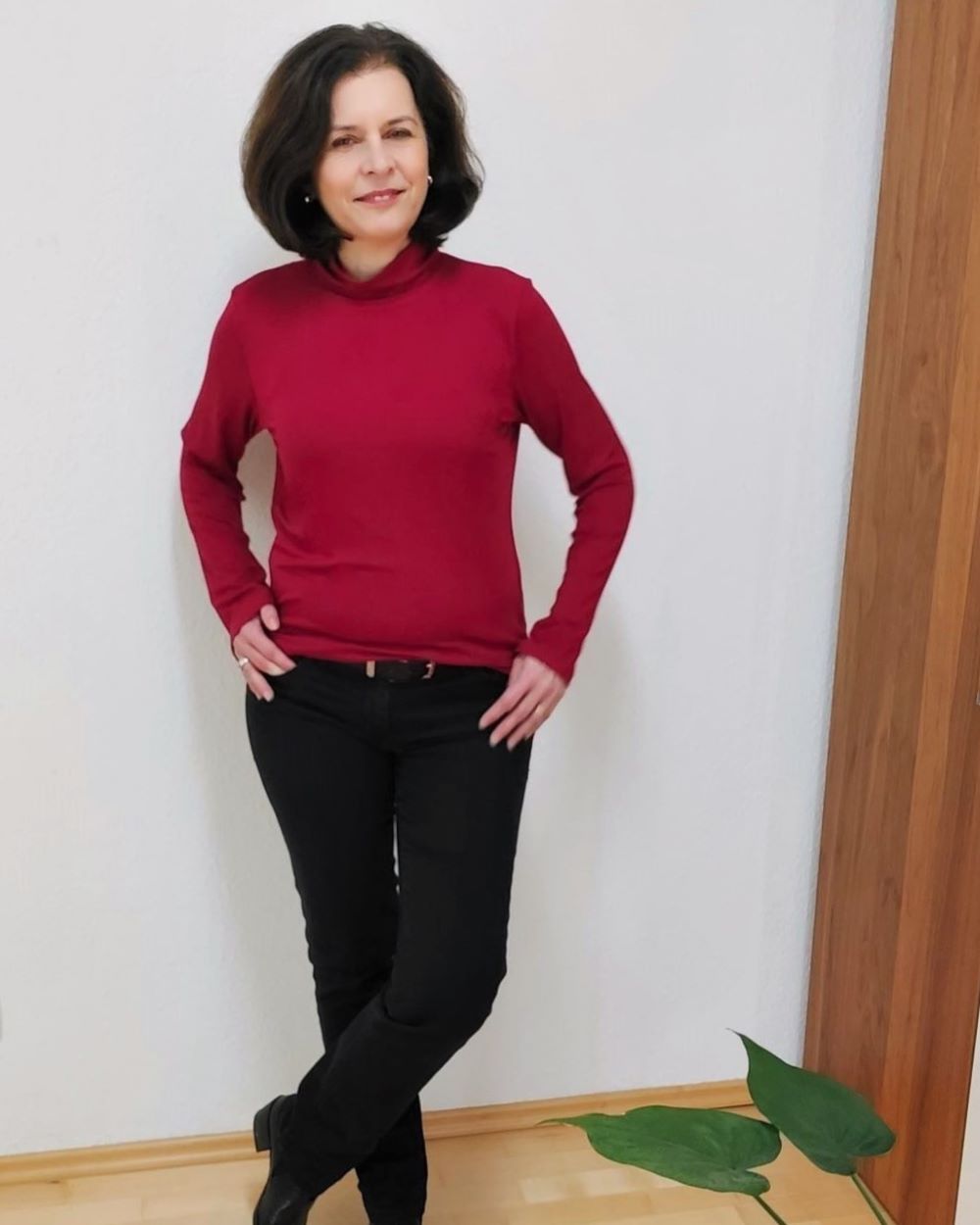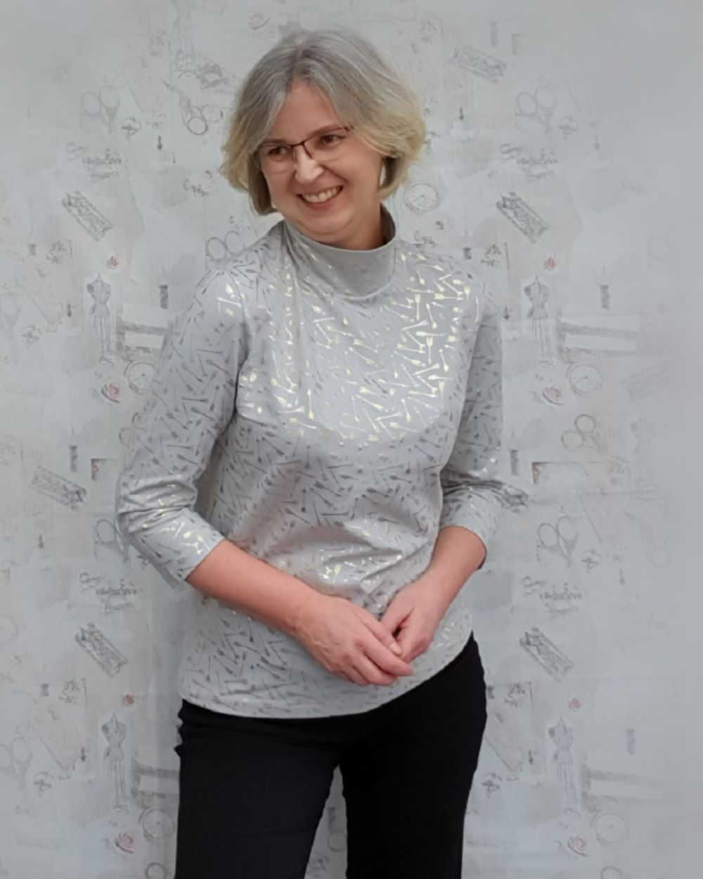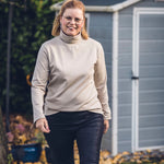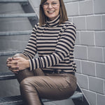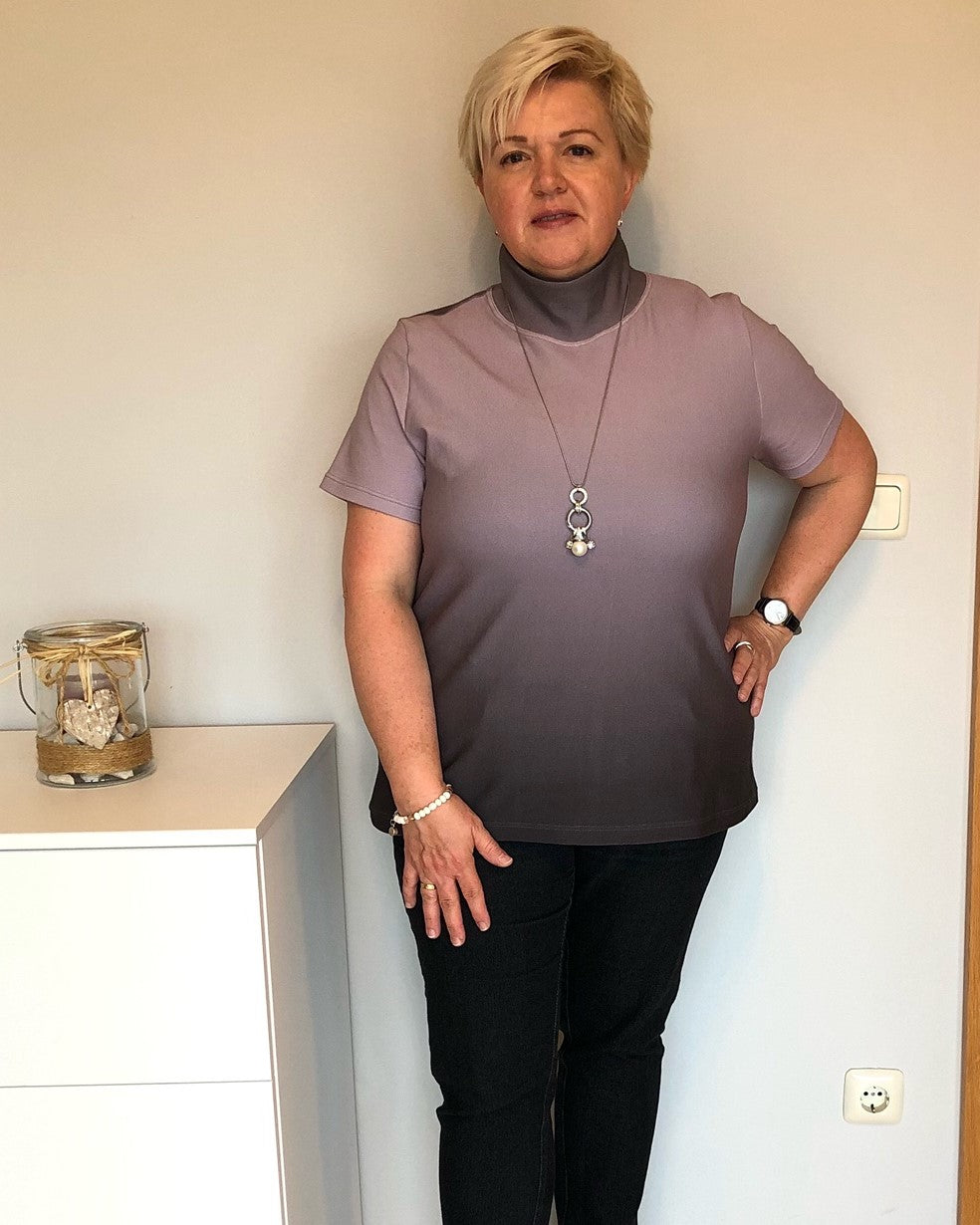 Lea ist etwas enger geschnitten damit es darunter nicht aufträgt. Das Shirt gibt es wahlweise mit Stehkragen oder mit klassischem Rollkragen.