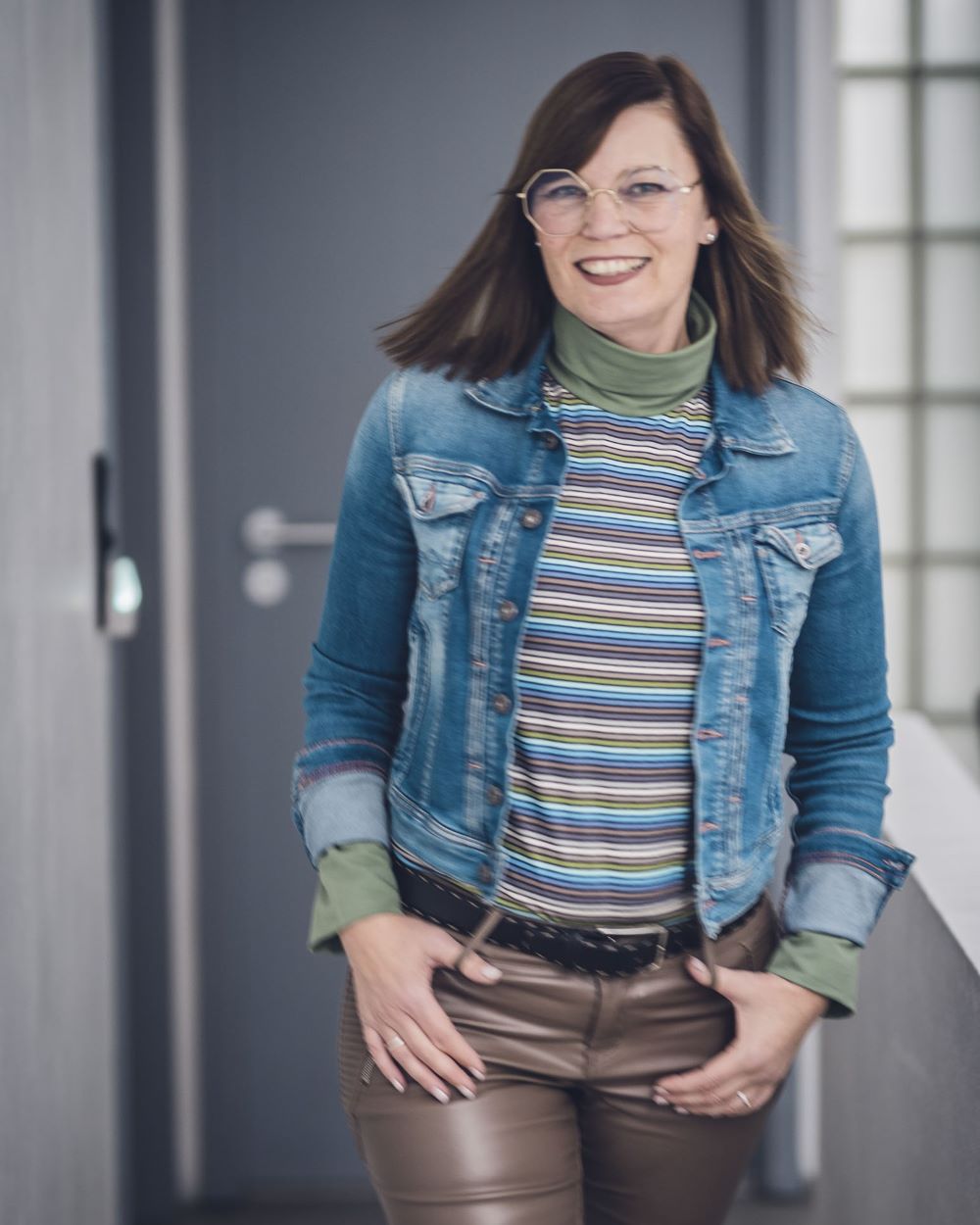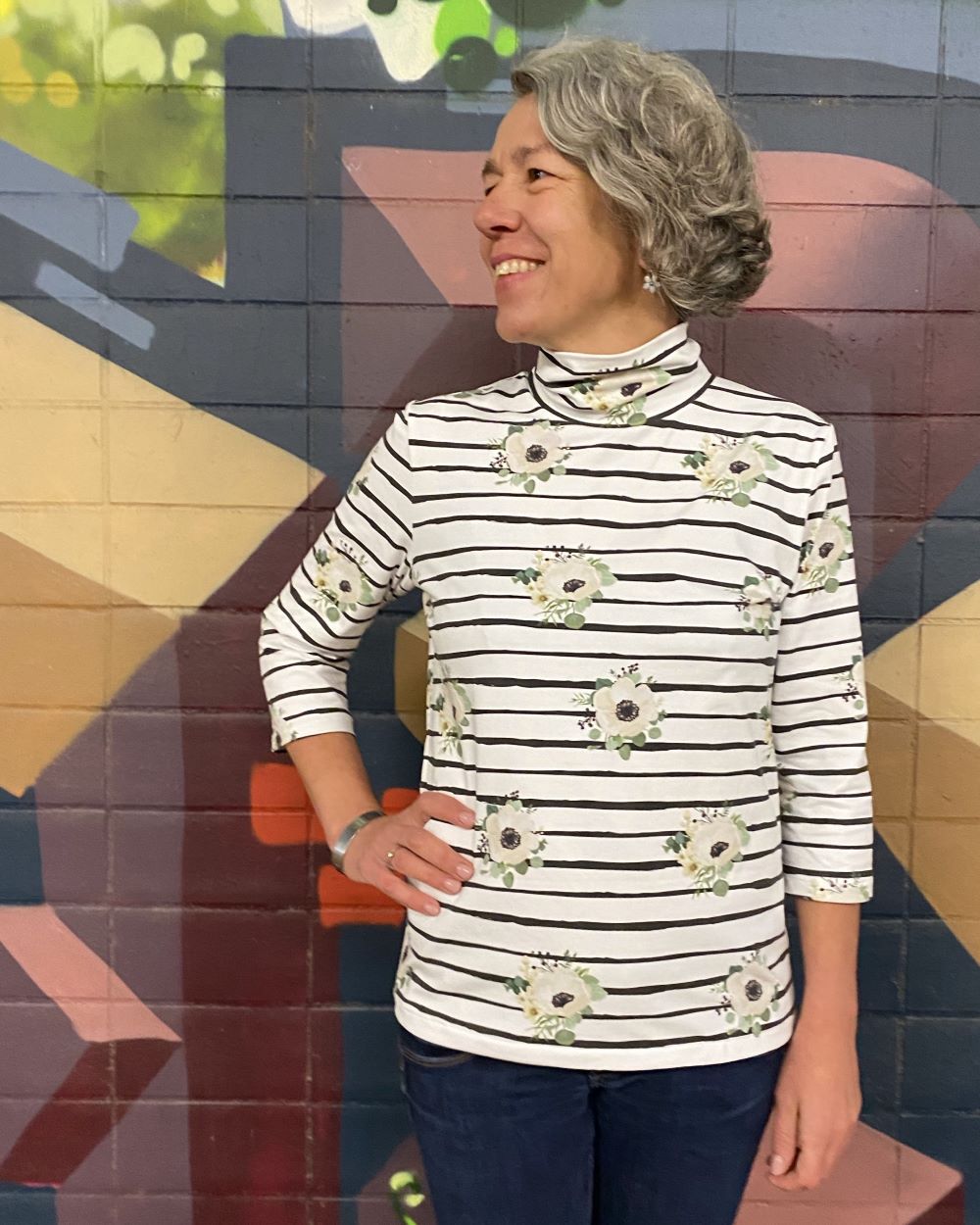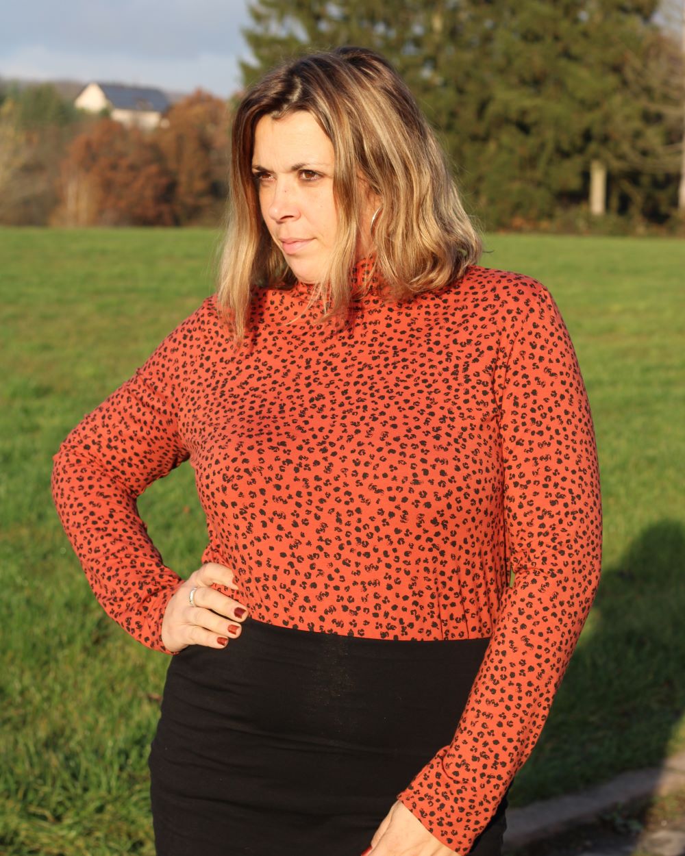 Lea ist etwas enger geschnitten damit es darunter nicht aufträgt. Das Shirt gibt es wahlweise mit Stehkragen oder mit klassischem Rollkragen.