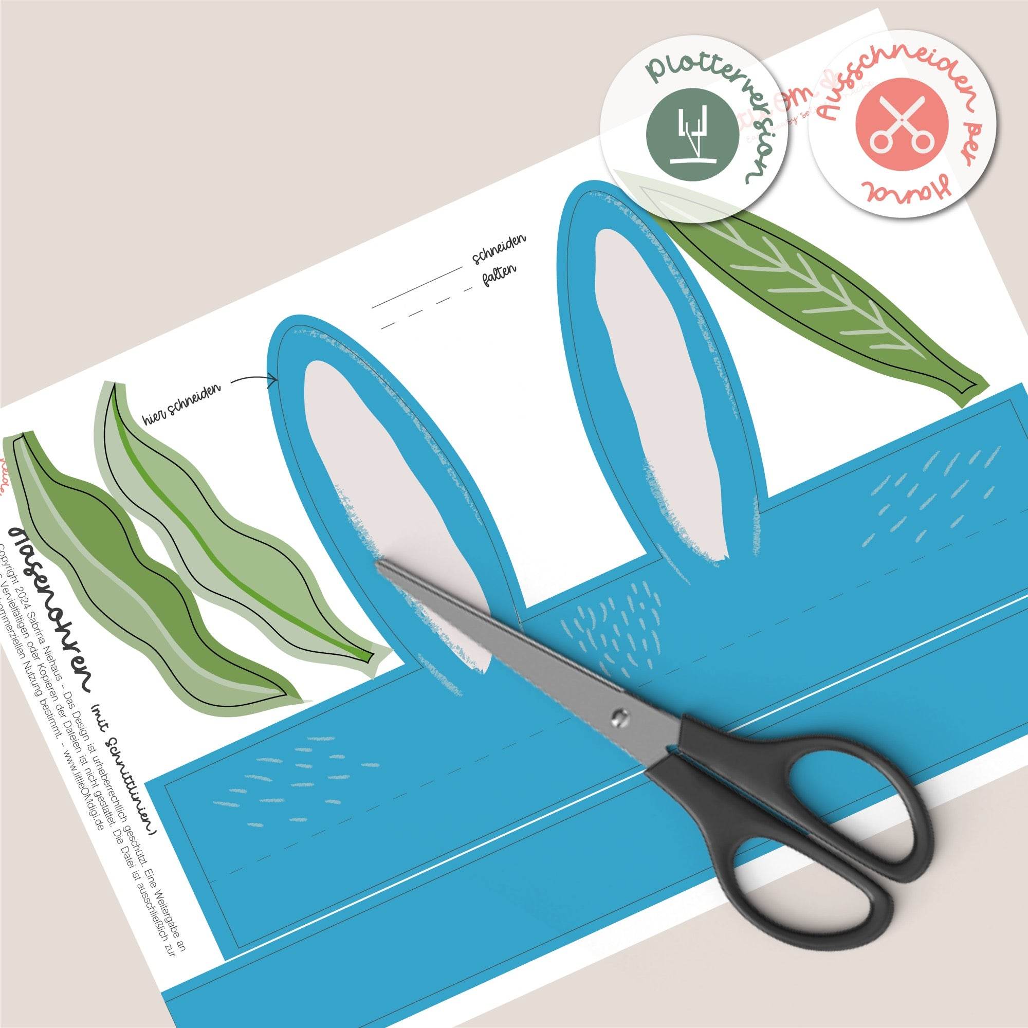 Neben den Hasenohren enthält das Set Blätter, die ausgeschnitten und mit denen das Stirnband nach den eigenen Vorstellungen verziert werden kann.