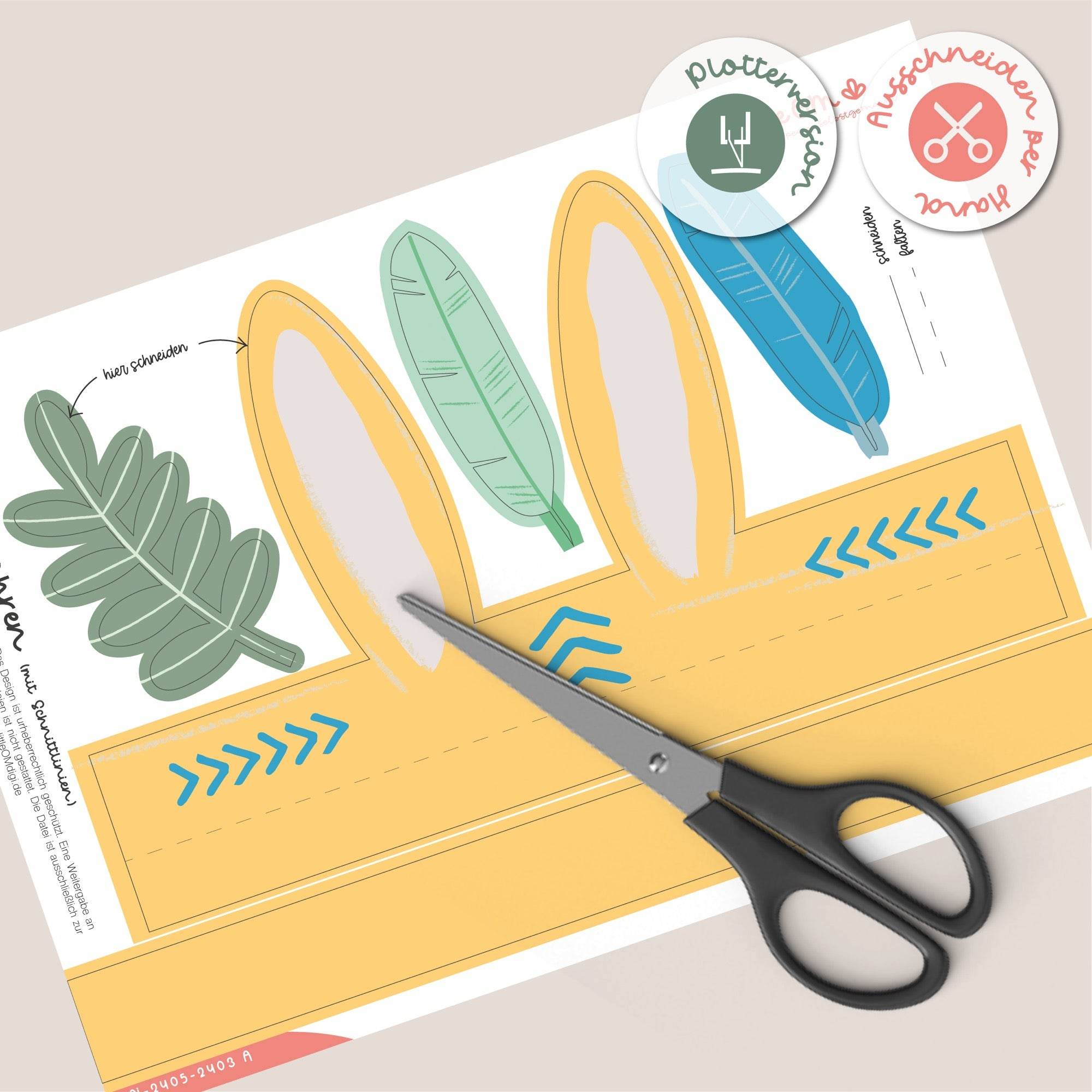 Neben den Hasenohren enthält das Set Blätter, die ausgeschnitten und mit denen das Stirnband nach den eigenen Vorstellungen verziert werden kann.