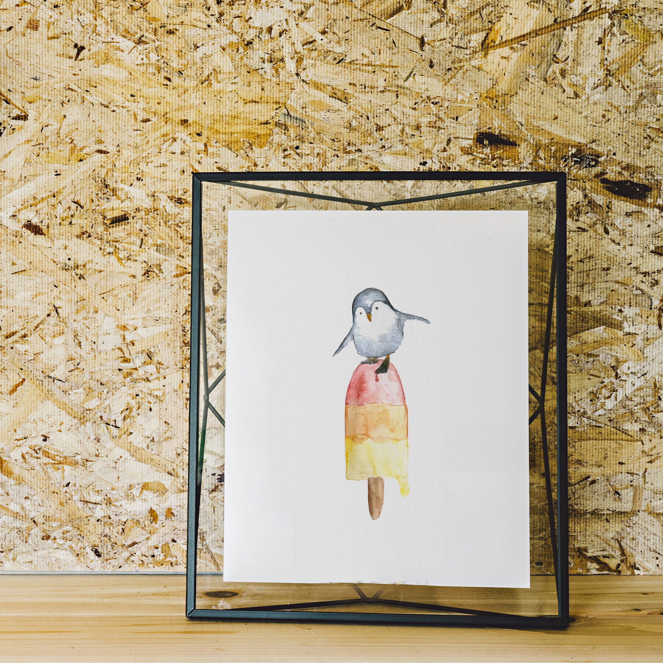 Der Pinguin am Eis ist ein verspieltes Motiv im Aquarell-Stil, Die Datei hat einen transparenten Hintergrund und ist perfekt für Drucke, Bügelbilder oder Kinderzimmerdekoration.