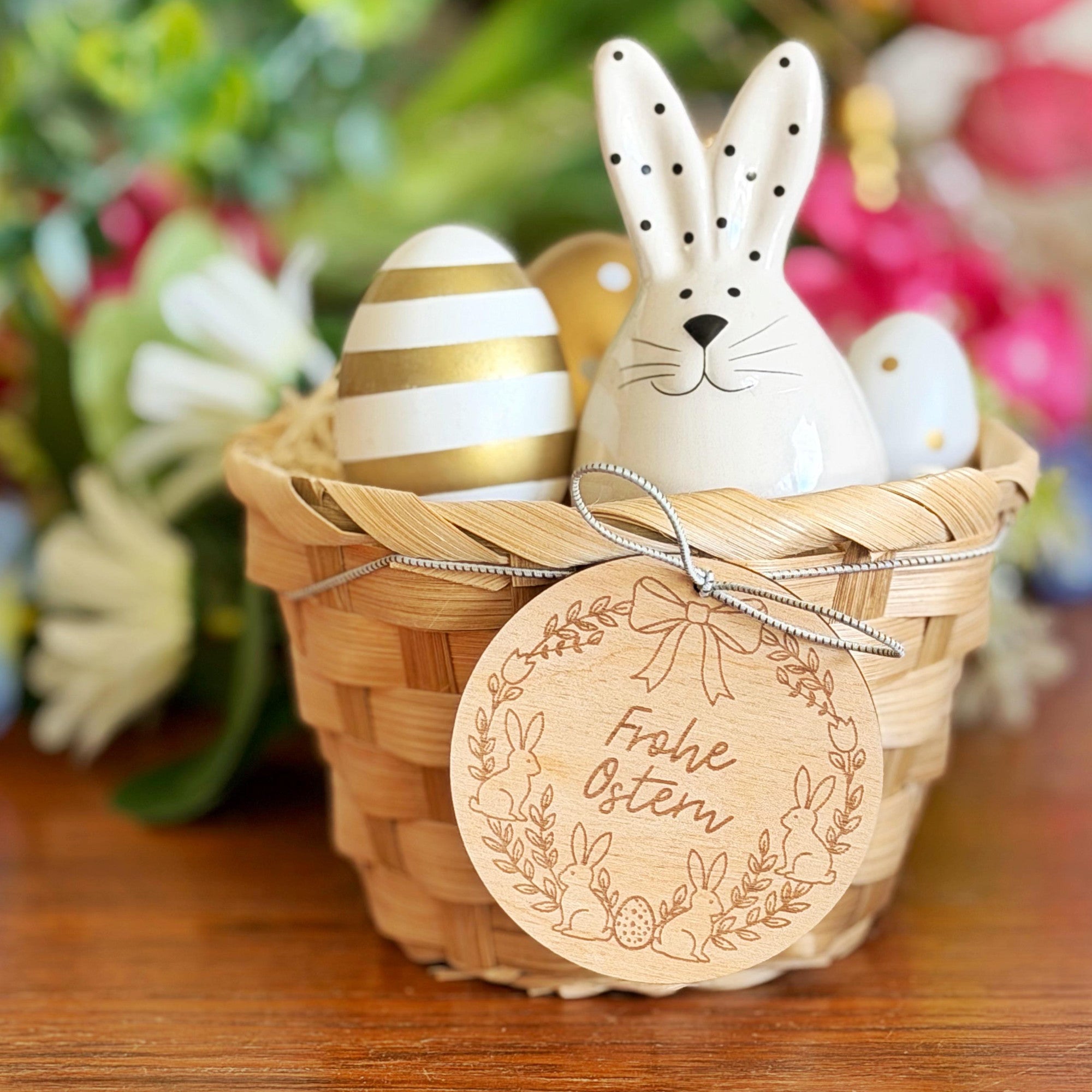 Der florale Eierkranz: Ein verspielter Mix aus Frühlingsblumen, zarten Blättern und gepunkteten Ostereiern.