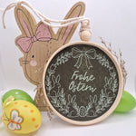 Der Schleifenkranz mit Häschen: Ein eleganter Blätterkranz mit einer großen Schleife, süßen Osterhasen-Silhouetten und einem zentralen Osterei.