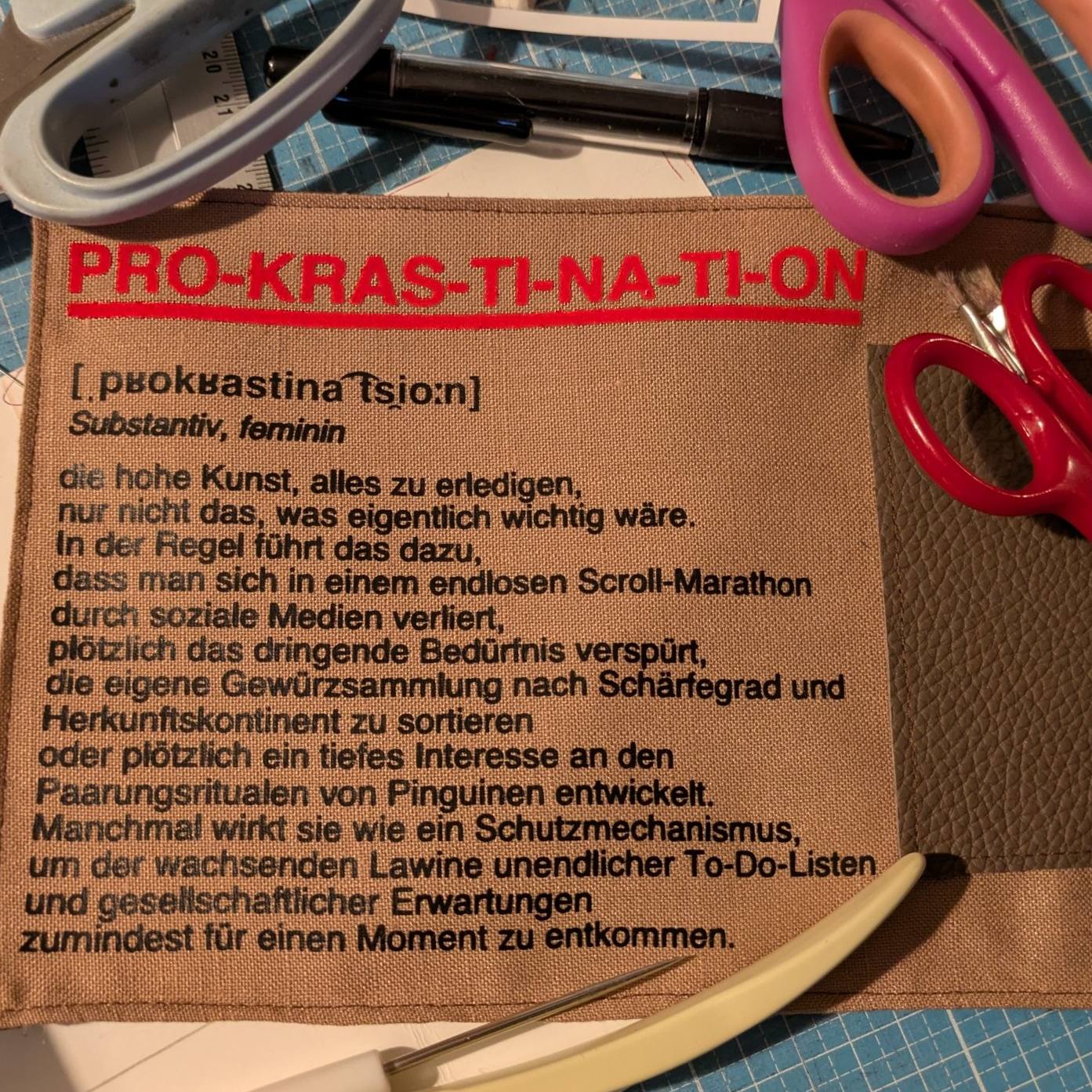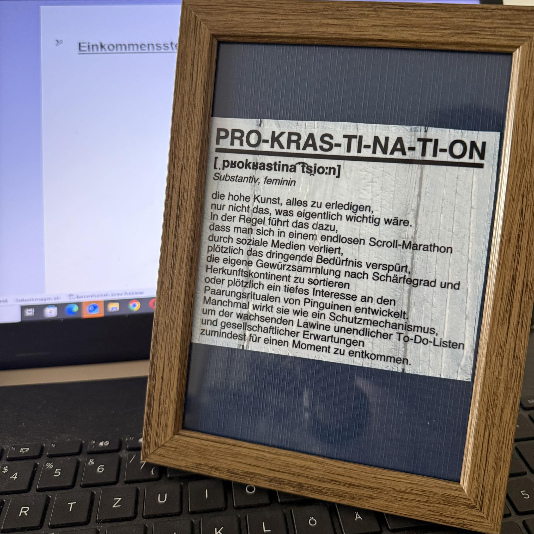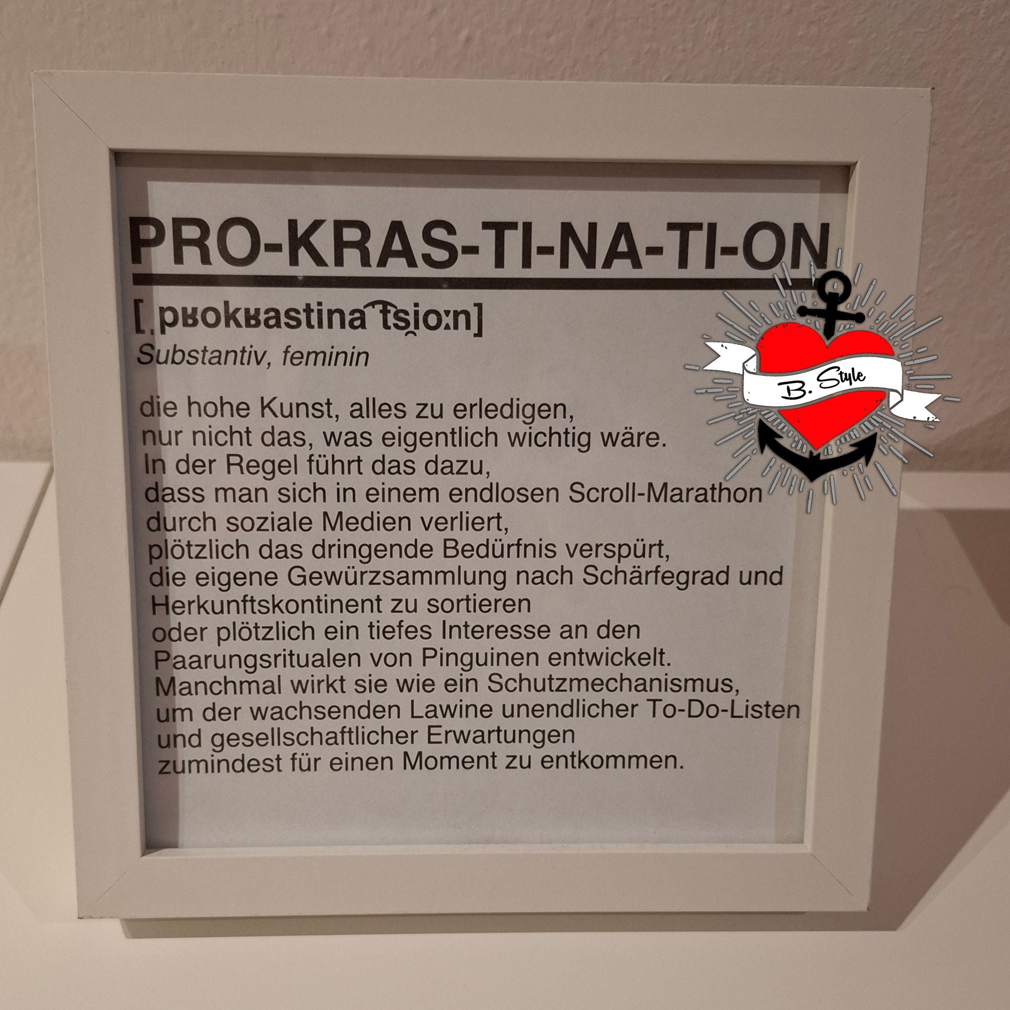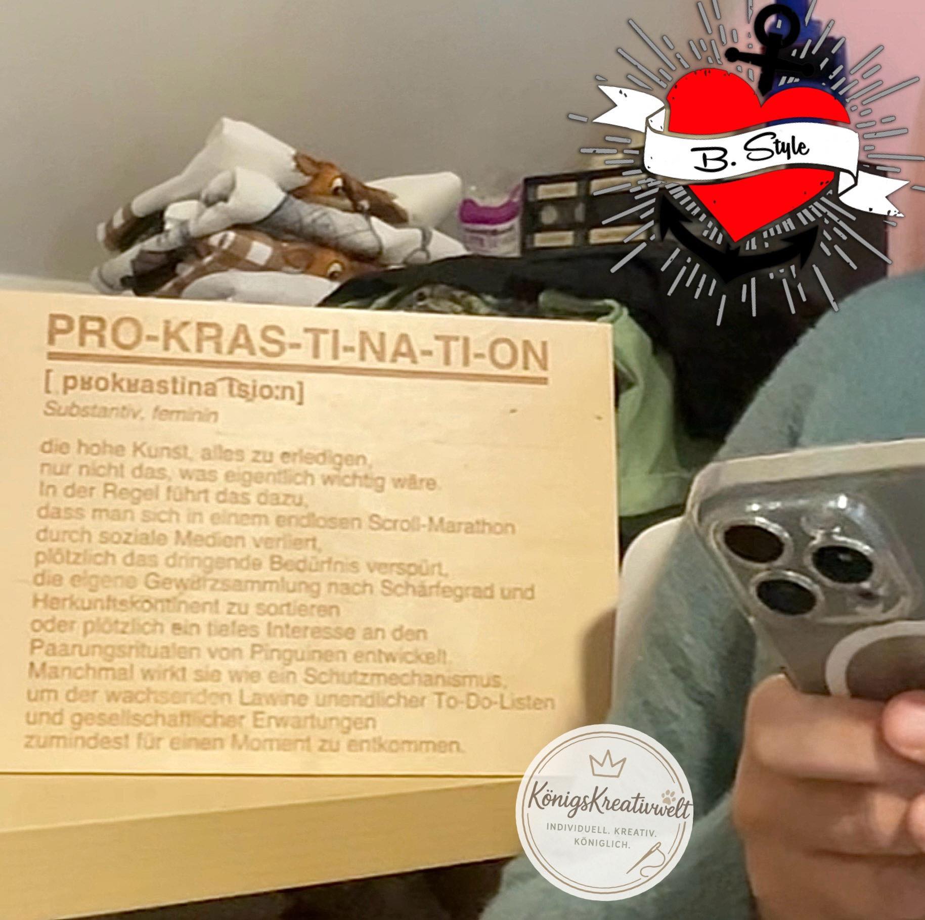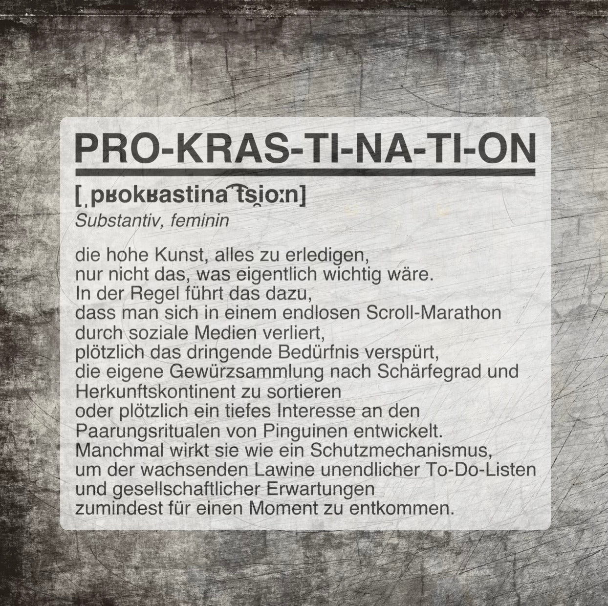 *die hohe Kunst, alles zu erledigen, nur nicht das, was eigentlich wichtig wäre. In der Regel führt das dazu, dass man sich in einem endlosen Scroll-Marathon durch soziale Medien verliert, plötzlich das dringende Bedürfnis verspürt, die eigene Gewürzsammlung nach Schärfegrad und Herkunftskontinent zu sortieren oder plötzlich ein tiefes Interesse an den Paarungsritualen von Pinguinen entwickelt. Manchmal wirkt sie wie ein Schutzmechanismus, um der wachsenden Lawine unendlicher To-Do-Listen und gesellschaftlicher Erwartungen zumindest für einen Moment zu entkommen.