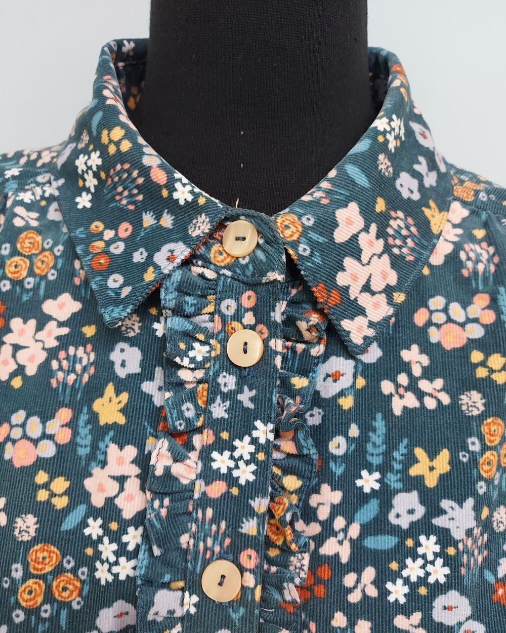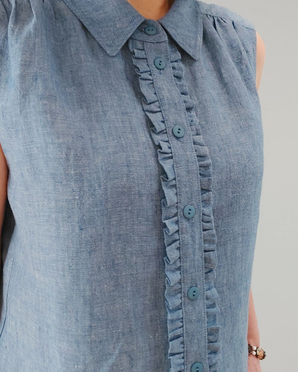 Dieses Vorderteil ist mit gerader Knopfleiste plus Hemdkragen mit Steg, sowie einer Anleitung für die Variante als Bluse ohne Ärmel.