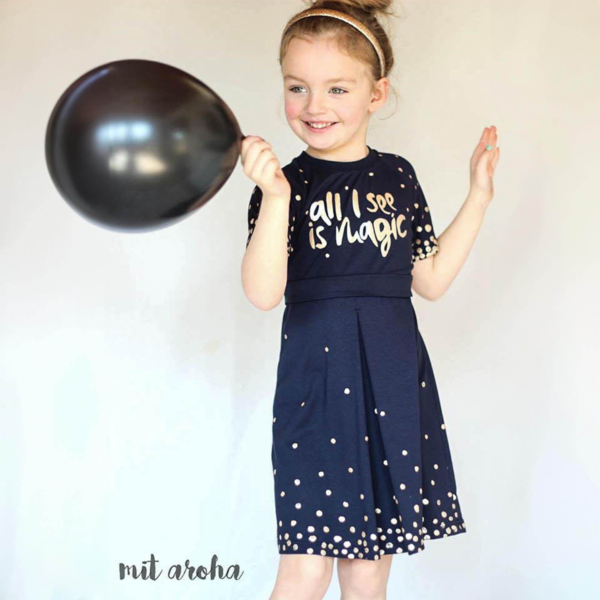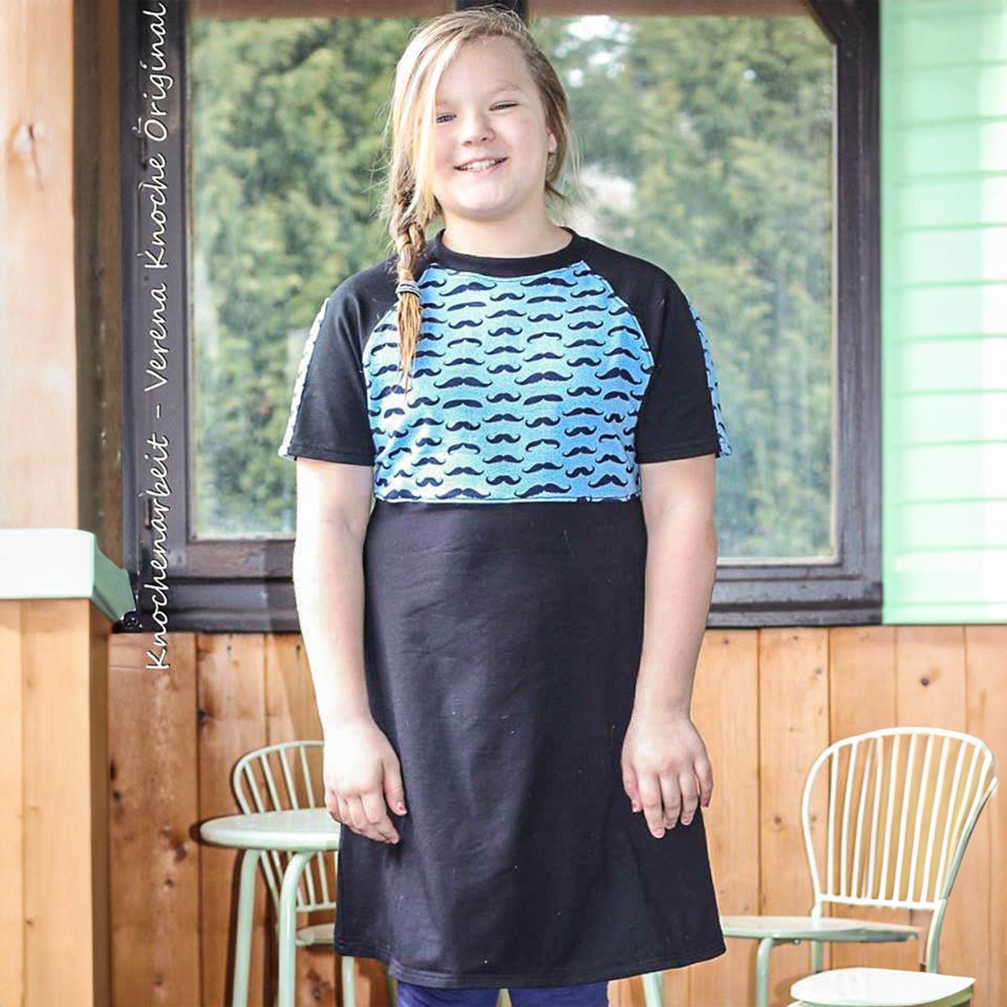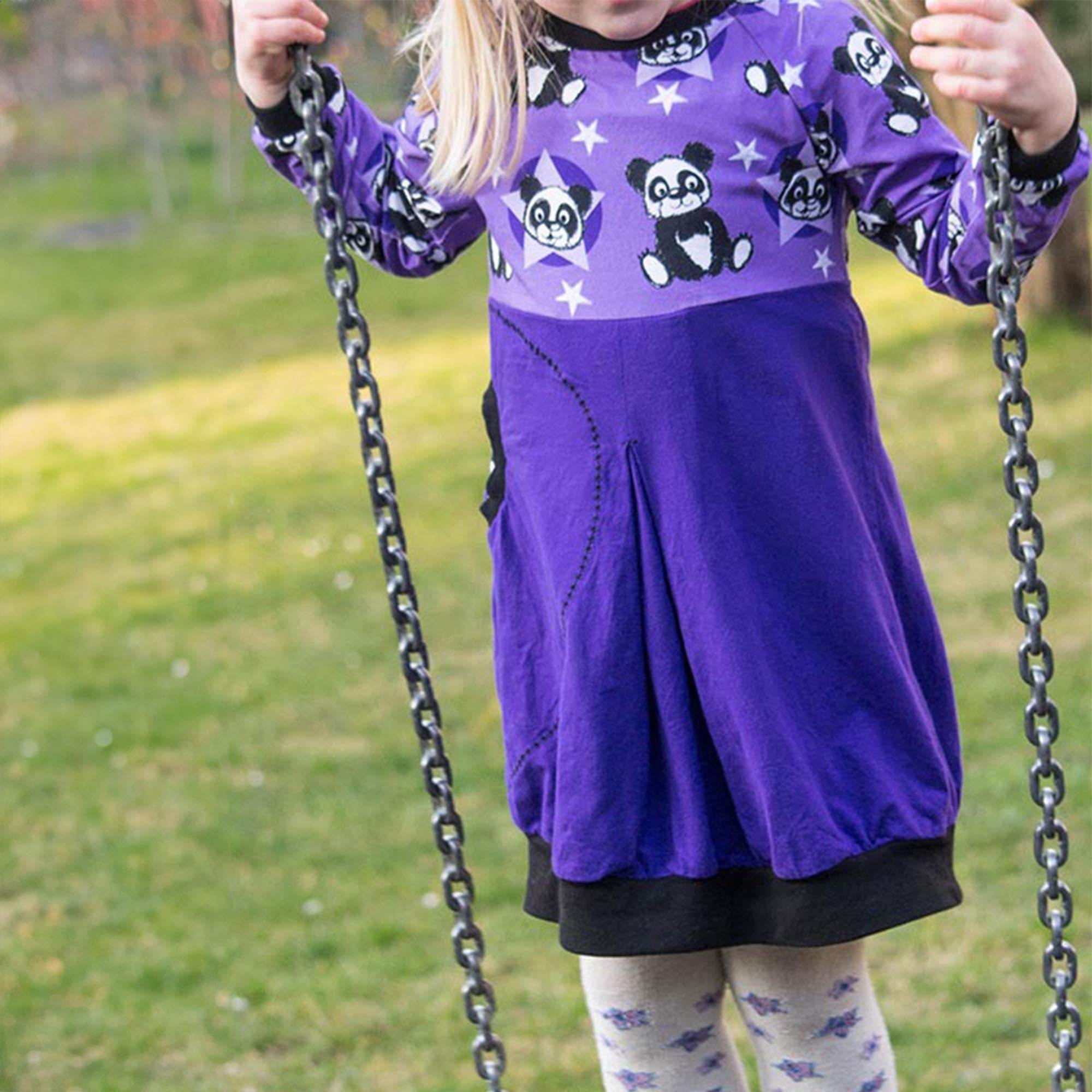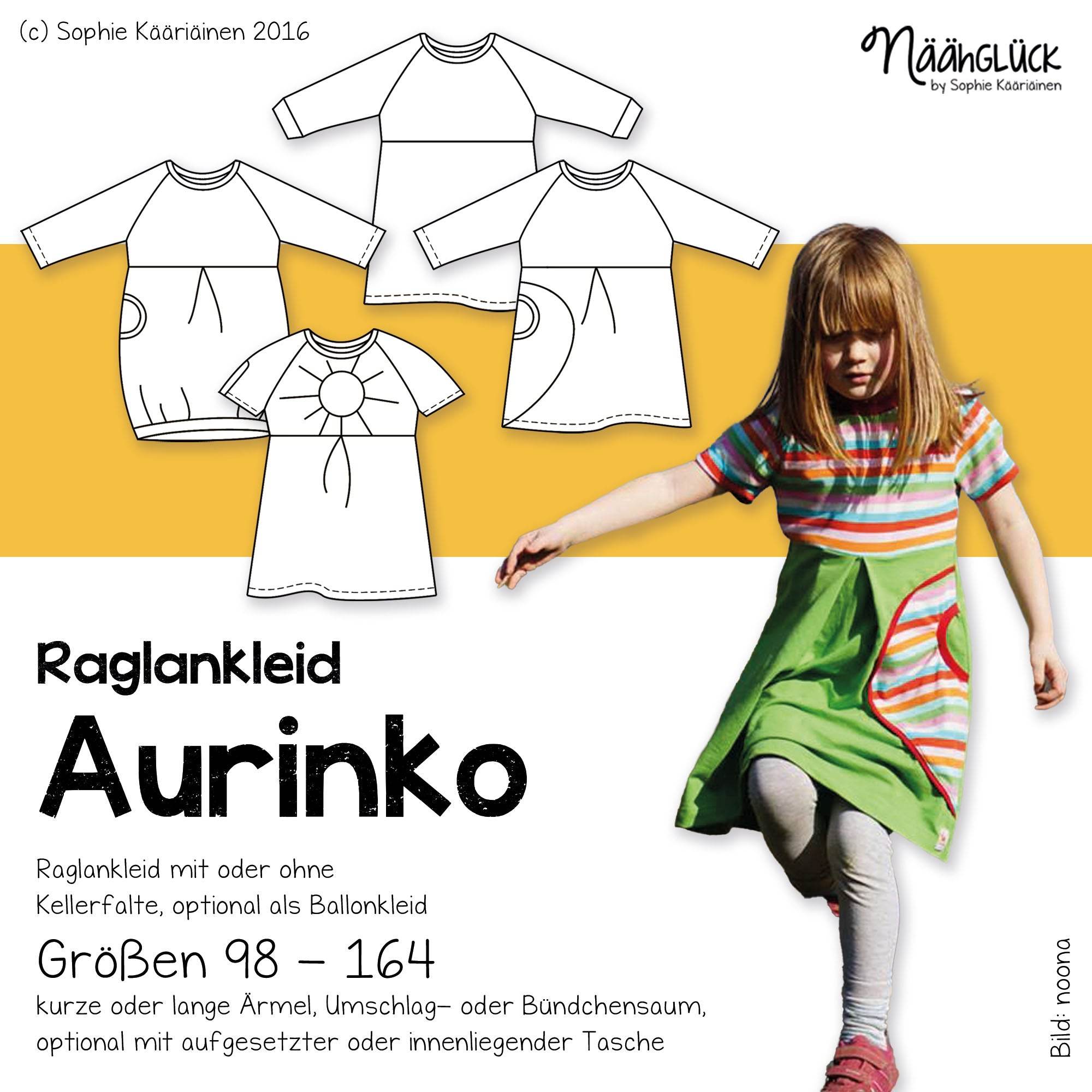 Das Kleid Aurinko ist ein Raglankleid, welches vielfach variiert werden kann. Die Ärmel können lang oder kurz genäht werden, die Saumabschlüsse können mit Bündchen oder durch Umschlagen gefertigt werden. Die Taschen sind innenliegend oder aufgenäht. Das Kleid kann mit oder ohne Kellerfalte genäht werden.