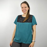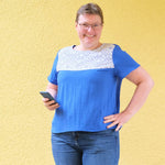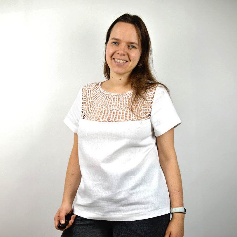 Die Bluse Pitsiä ist eine einfache Bluse mit Spitzeneinsatz, eingefasstem Halsausschnitt und Abnähern. Du kannst die Bluse mit Spitzeneinsatz oder ohne Teilung nähen.