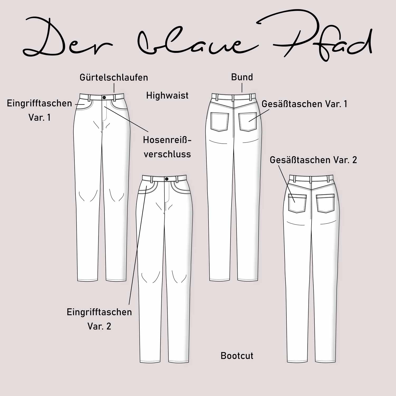 Dieses Schnittmuster für eine Damen High Waist Bootcut Jeans aus Jeansstoffen mit max. 3% Elasthan und 2 verschiedenen Taschenformen für einen klassischen und einen besondereren Look, trägt den schönen Namen "Der blaue Pfad". Das Schnittmuster beinhaltet natürlich eine ausführliche Anleitung und die Damen Größen 32 - 62 ausgelegt auf eine Körpergröße von 1,68m und wird dir nach dem Kauf als Sofort Download in PDF Format zur Verfügung gestellt.
