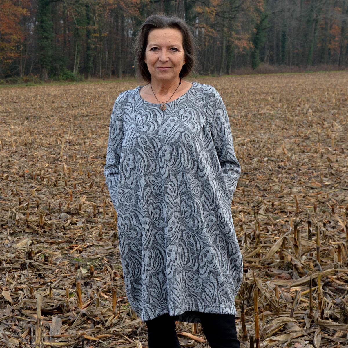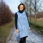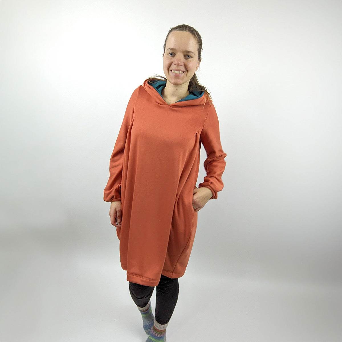 Tonttu ist ein bequemes weit geschnittenes Kleid mit charakteristischen Falten am Armausschnitt bis hin in die Seitennaht, in denen sich auch noch praktische Taschen verstecken.