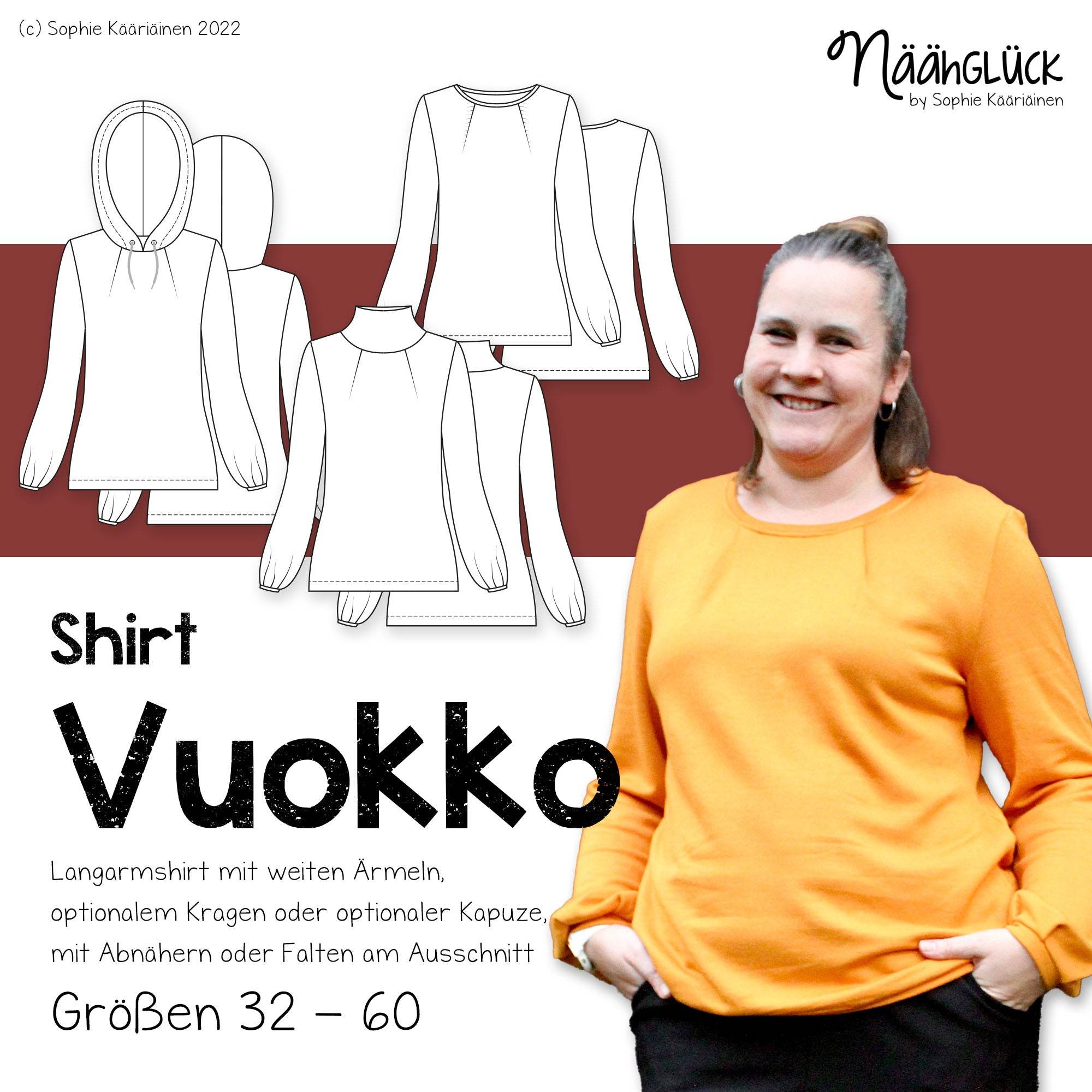 Vuokko ist ein Shirt mit charakteristischen Ärmeln mit gelegten Falten am Ärmelsaum. Die Brustabnäher kannst du nähen oder auch als Falten legen. Alternativ zum Halsbündchen kannst du auch einen Kragen oder eine Kapuze an deine Vuokko annähen.