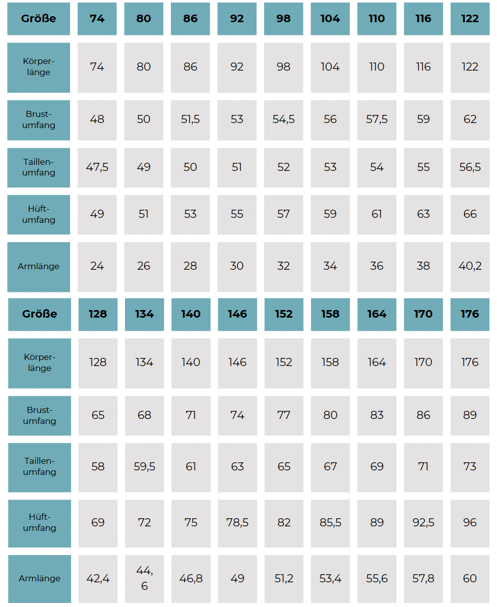 Von Größe 74 bis 176 wächst Skylar mit – vom ersten Kindergartenabenteuer bis zum selbstbewussten Schulmädchen-Look.