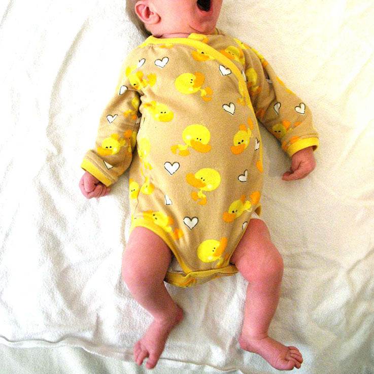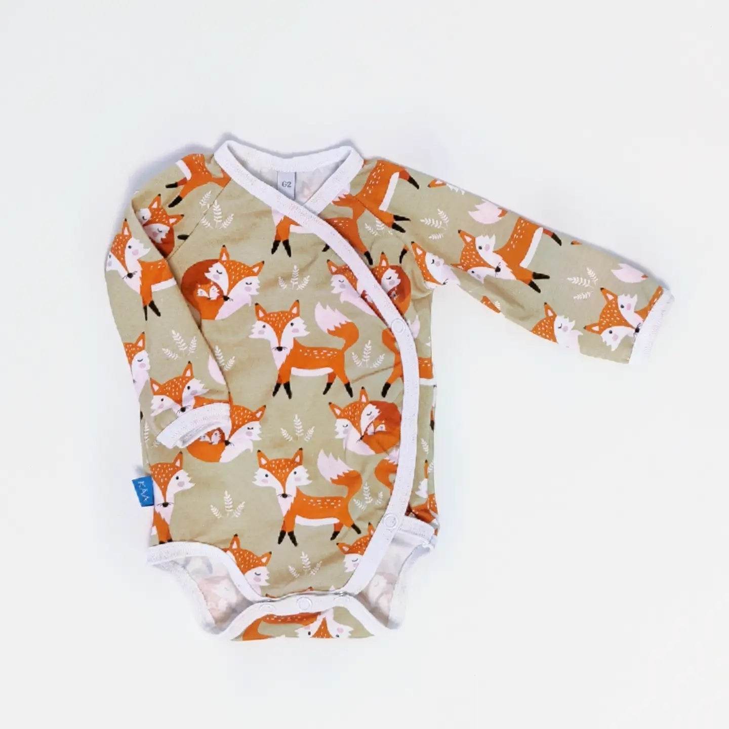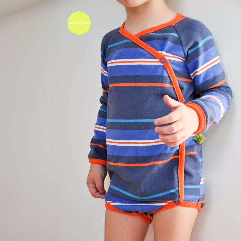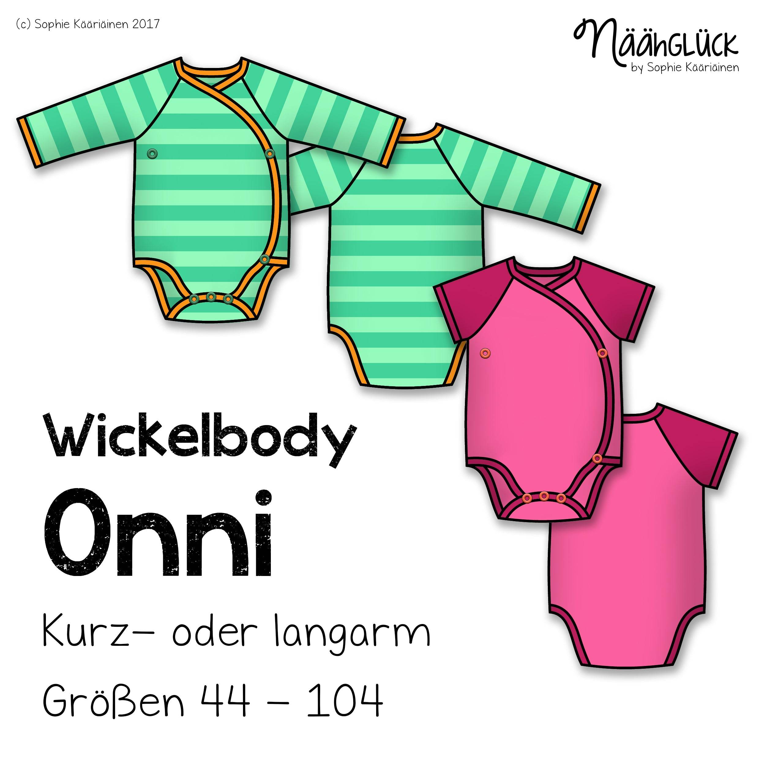 Der Wickelbody Onni - Finnisch für „Glück“ - kleidet alle kleinen Wesen warm. Durch das Überlappen der Vorderteile muss nichts über die zarten Köpfchen gezogen werden. Er kann mit kurzen oder langen Ärmel genäht werden und wird durch 6 Druckknöpfe oder 4 Bindebänder und 3 Druckknöpfe geschlossen.