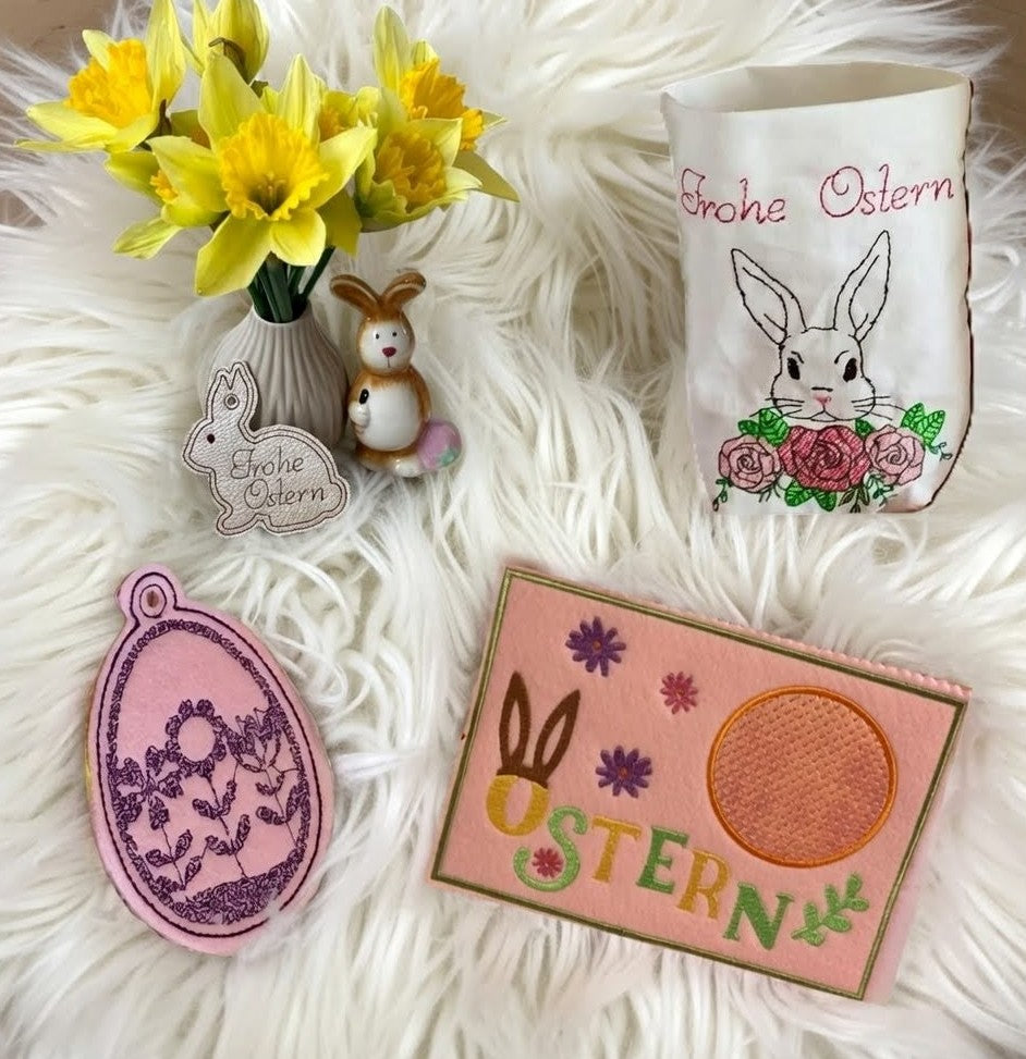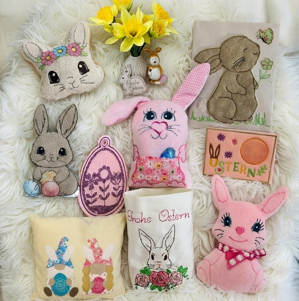 Dabei findest du Doodle-Dateien, In the Hoop Muster, Kuscheltiere, Einzelmotive und liebevoll gestaltete Anhänger – perfekt für kreative Nähideen zu Ostern.