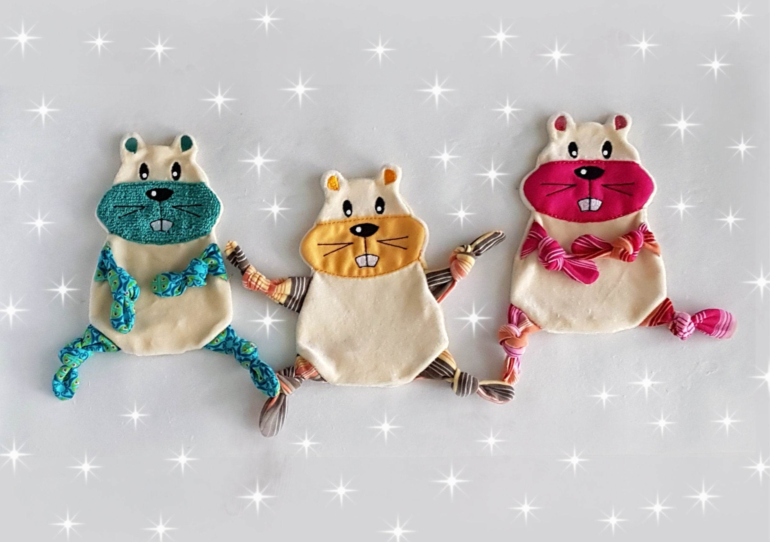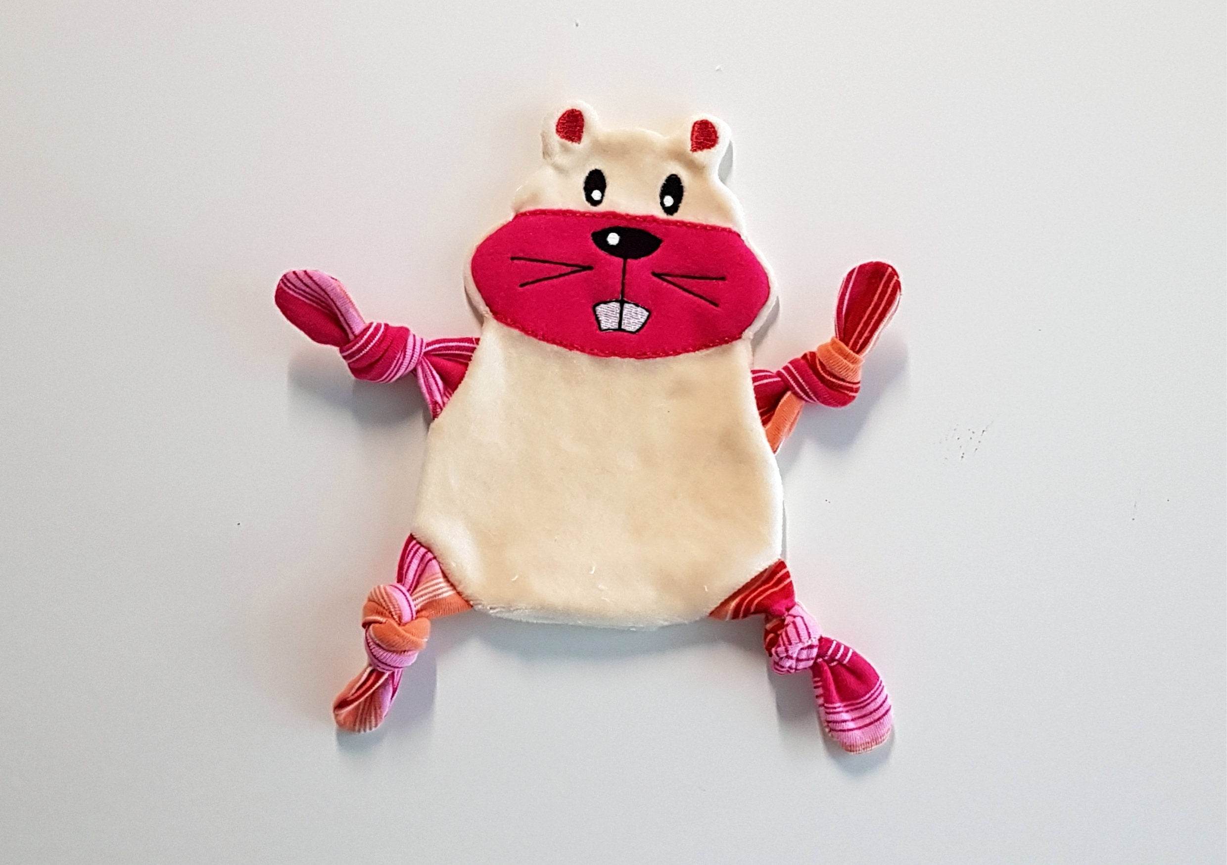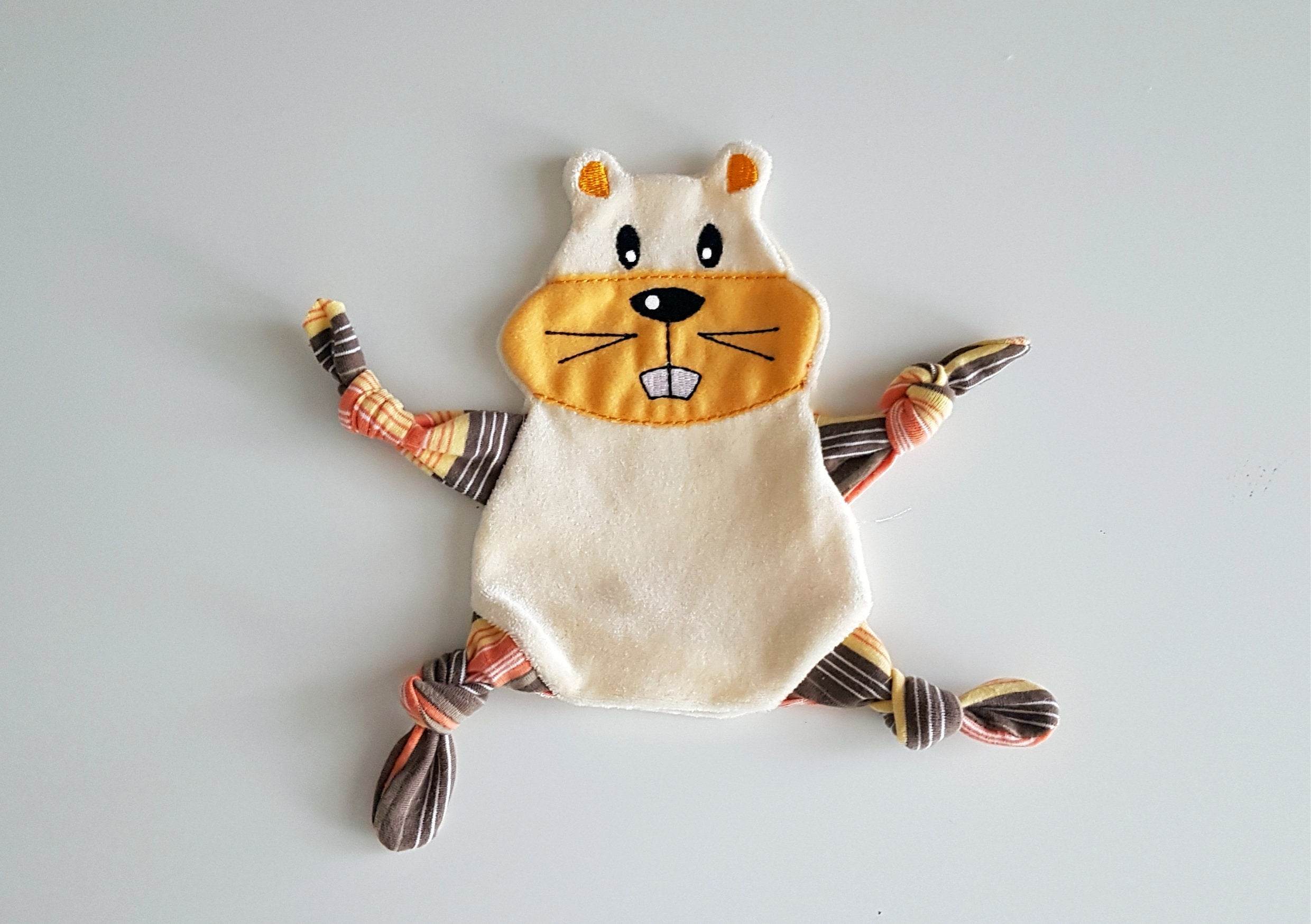 Hier kommt ein witziger Hamster als Kuscheltuch. Er ist ein treuer Begleiter und freut sich über Streicheleinheiten.
