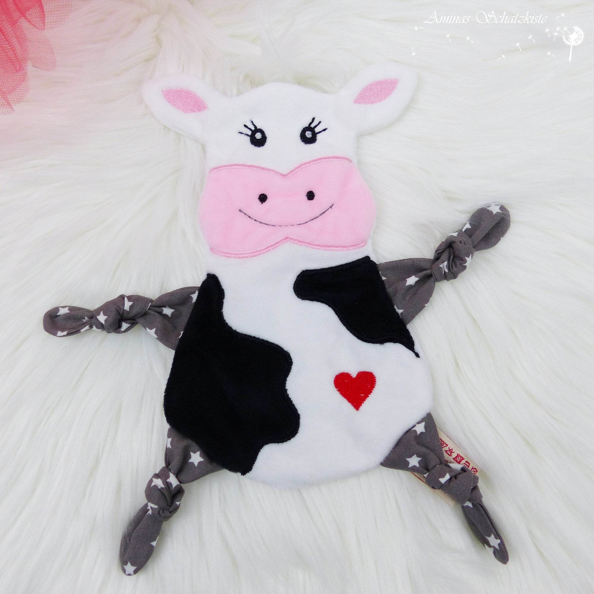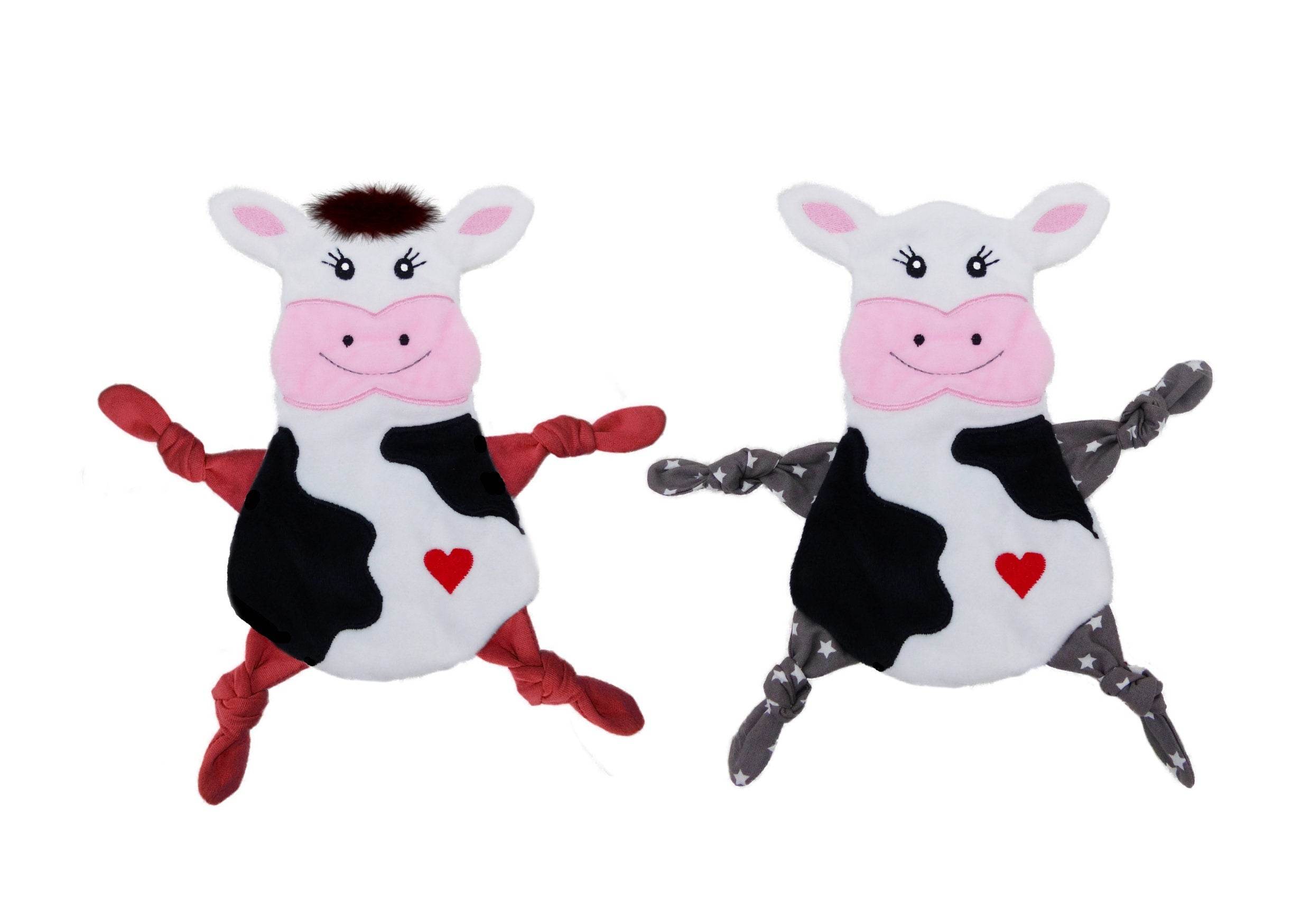 Hier kommt eine süße Kuh als Kuscheltuch. Sie ist ein treuer Begleiter und freut sich über Streicheleinheiten. Egal ob mit Haarpuschel oder ohne - einfach niedlich.