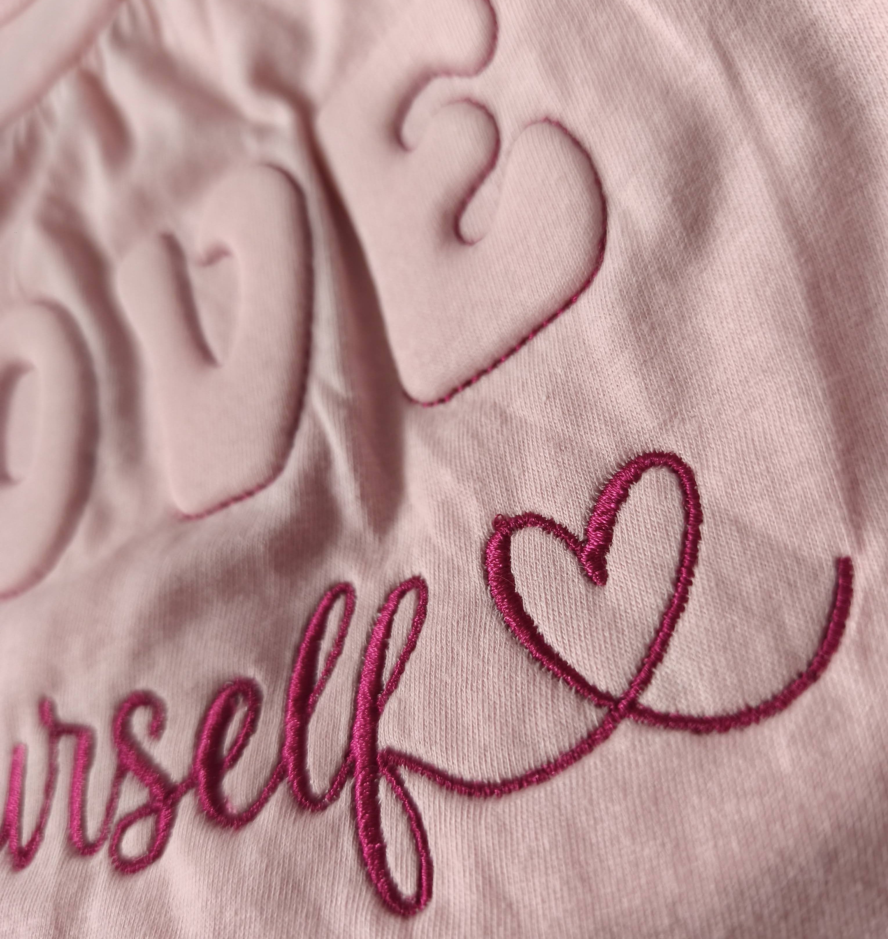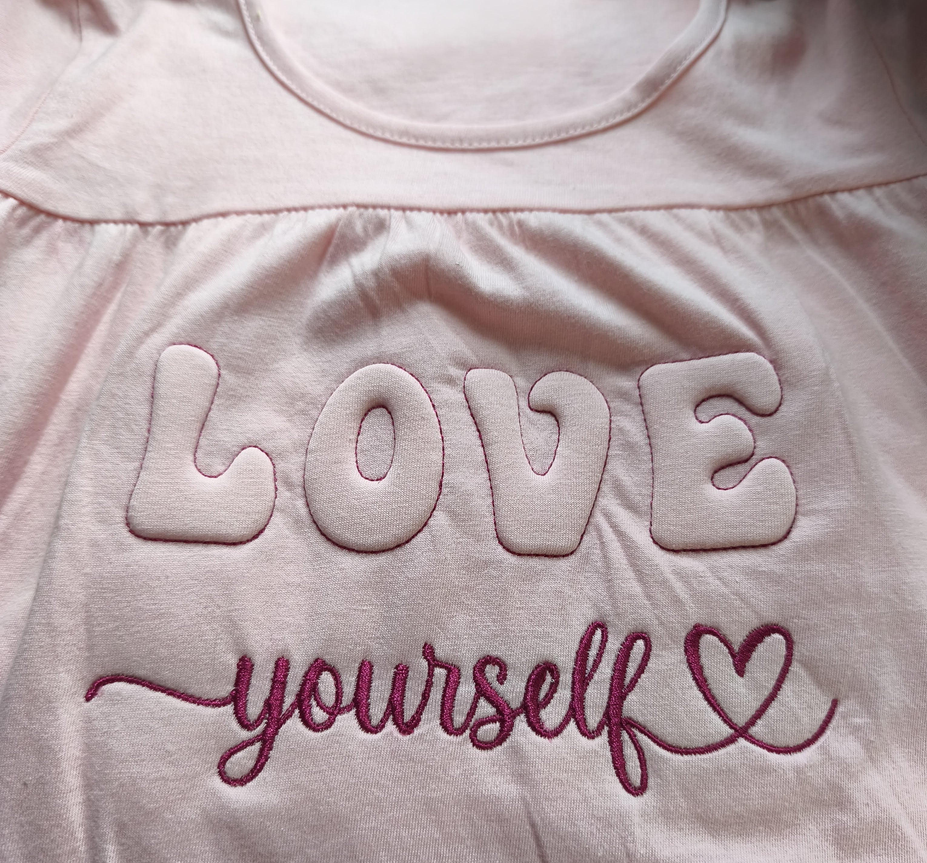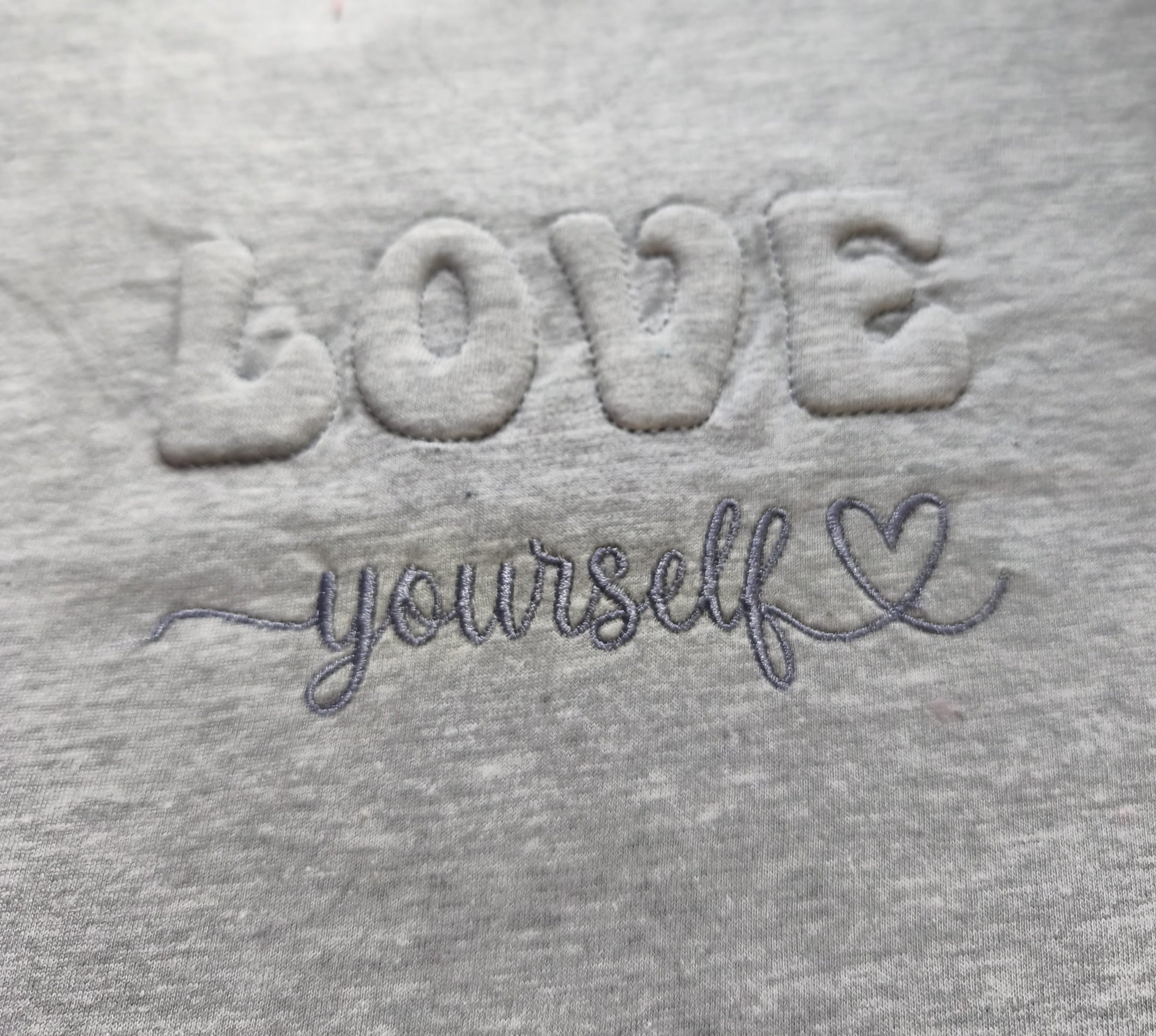 Mit dieser hochwertigen 3D Stickdatei Love yourself bringst du stilvolle und liebevolle Details auf Kissen, Taschen oder Shirts. Setze persönliche Akzente auf Stoffen und verwandle einfache Textilien in einzigartige Unikate.
