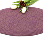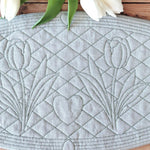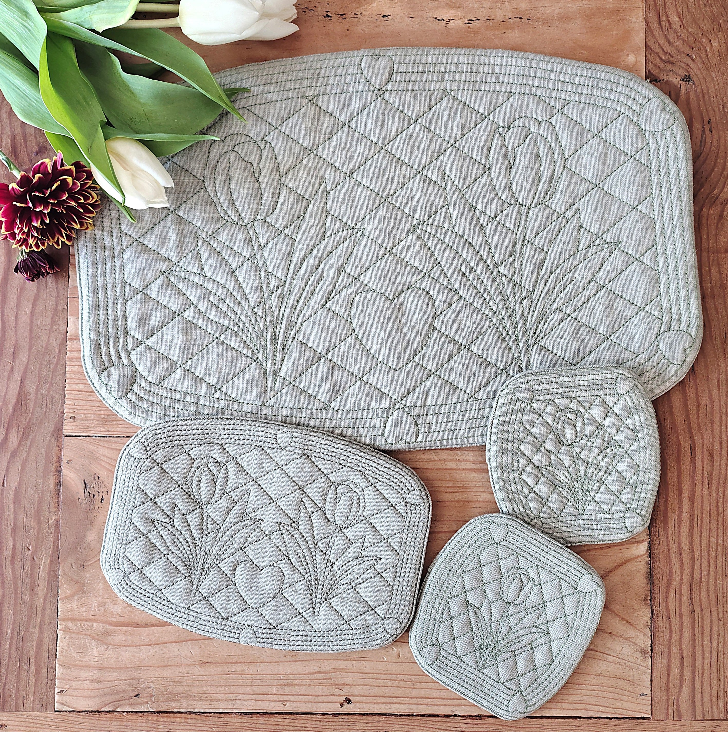 Jeder Untersetzer zeigt ein harmonisches Quilt-Muster mit Tulpen und Herz.