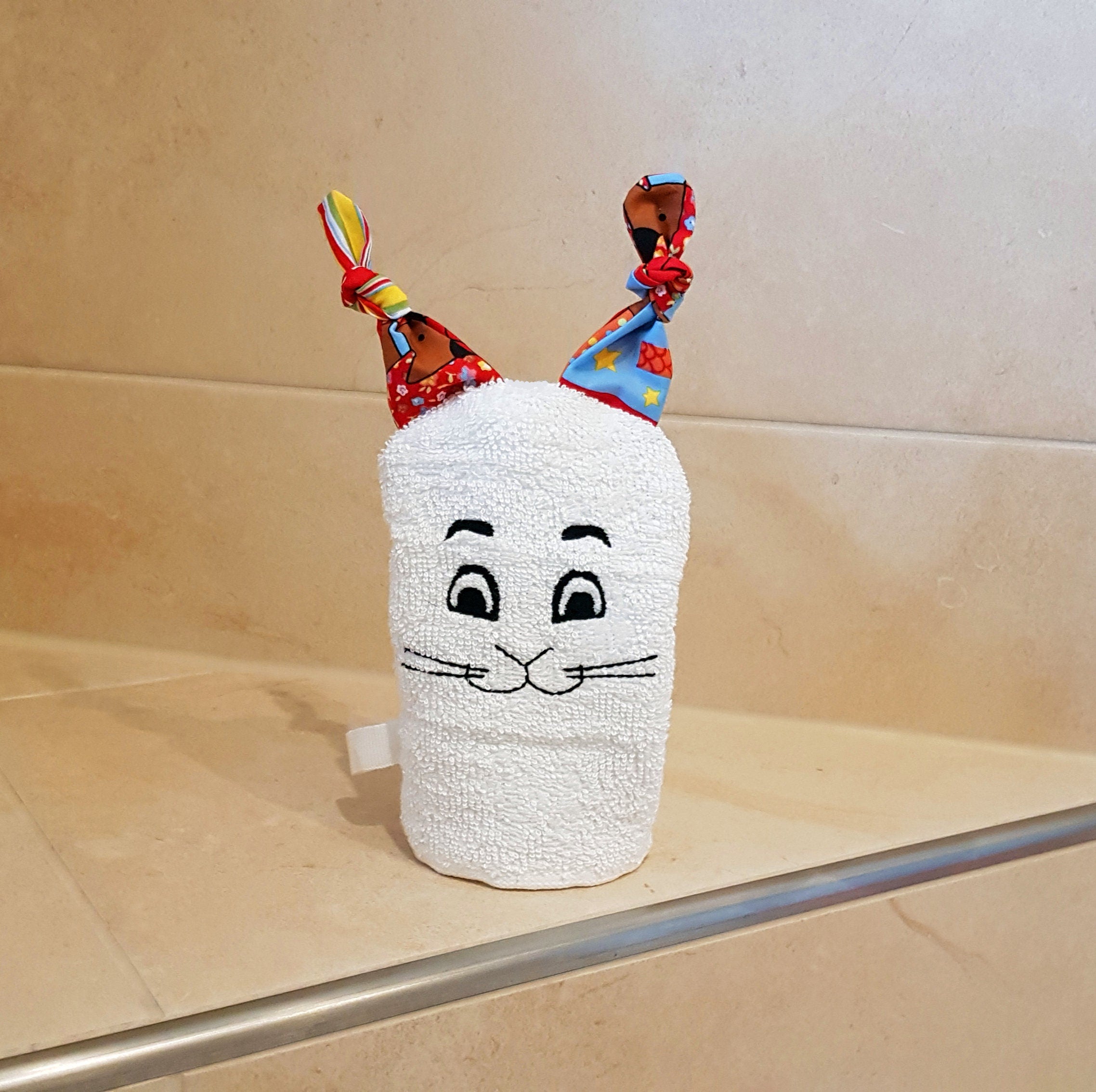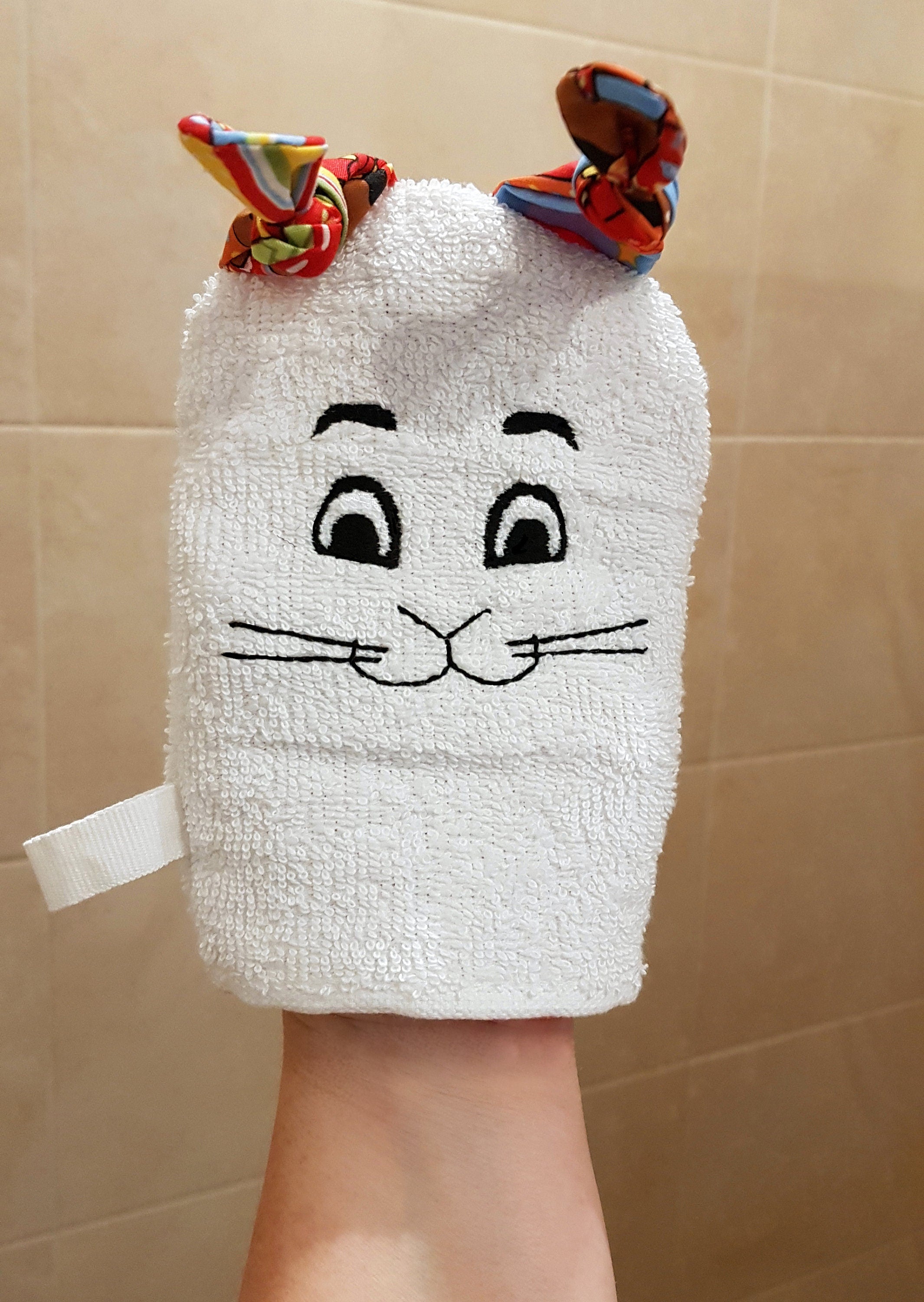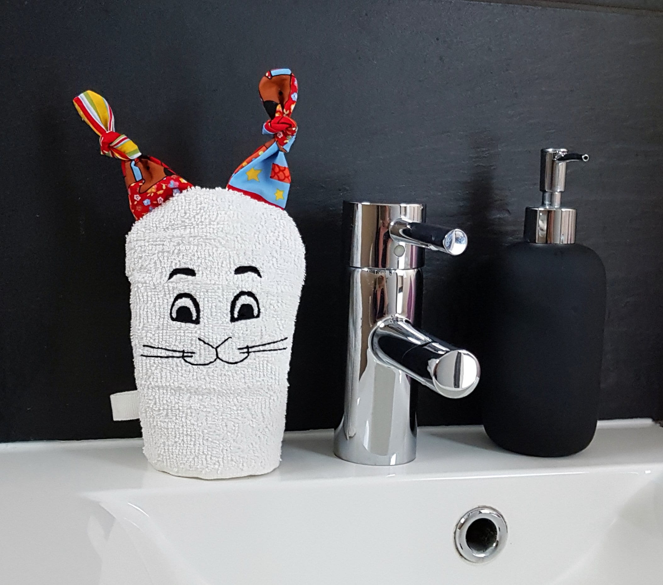 Diese ITH-Datei wird komplett in der Stickmaschine gestickt. Der fertige Waschlappen hat die Maße: 12 cm breit und 17 cm lang - zzgl. Ohren.