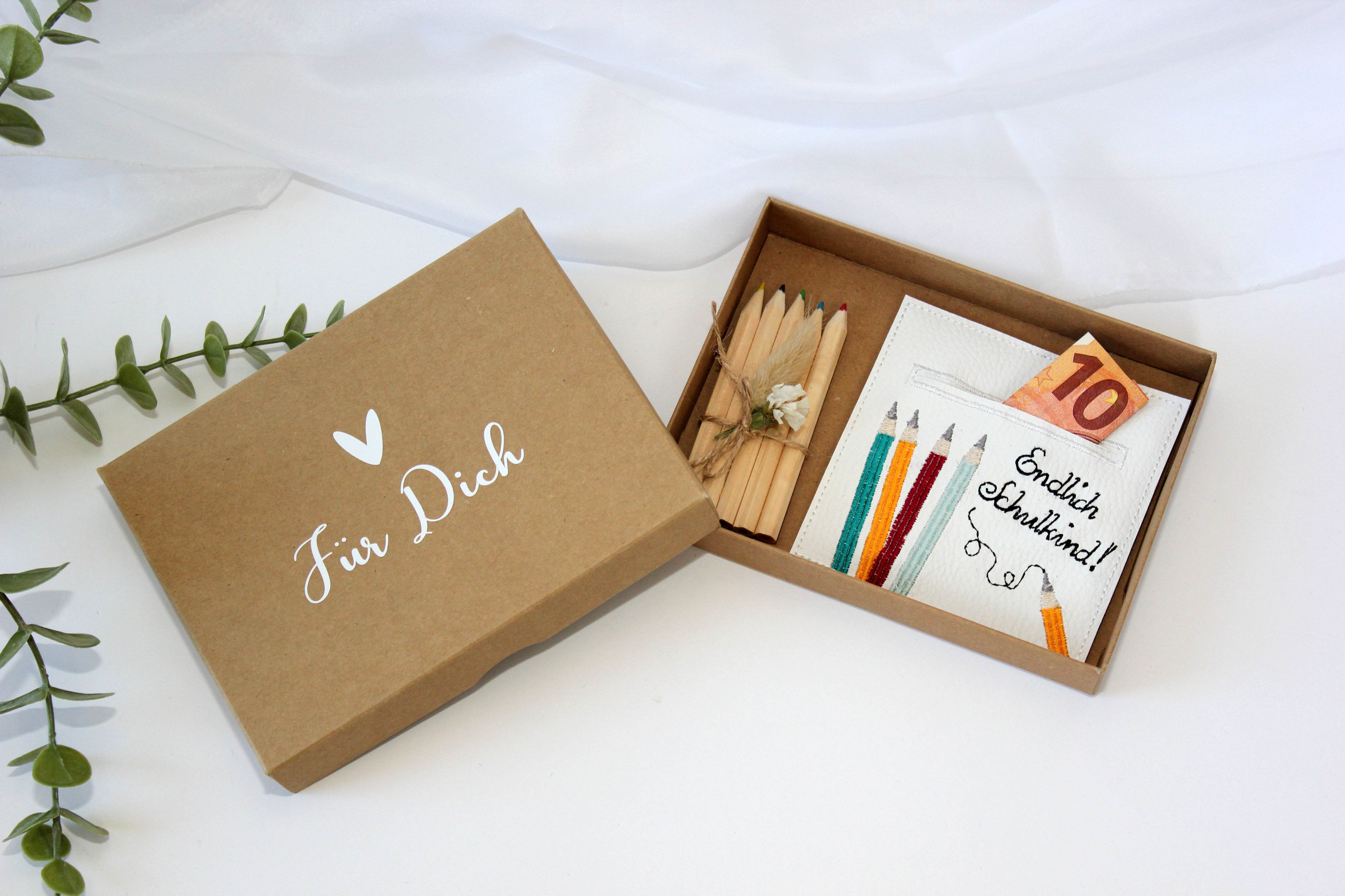 Verschenke Geld und Glückwünsche zur Einschulung, hübsch verpackt in diesem Wunscherfüller. Dieser wird mit bunten Stiften und dem Spruch "endlich Schulkind" bestickt.
