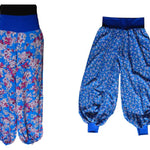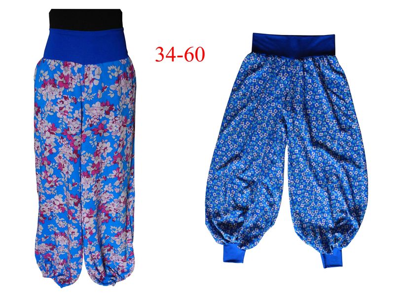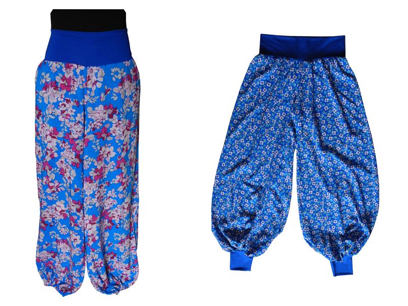 Die Hosen sind weit und bequem. Der Bund wird aus einem breiten Bündchenstoff oder Jersey genäht.